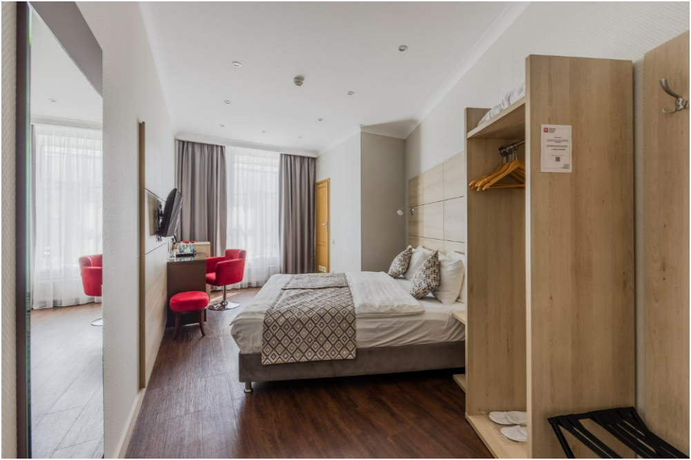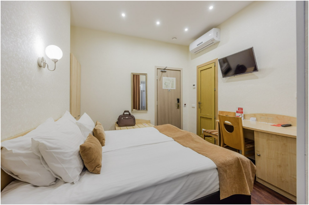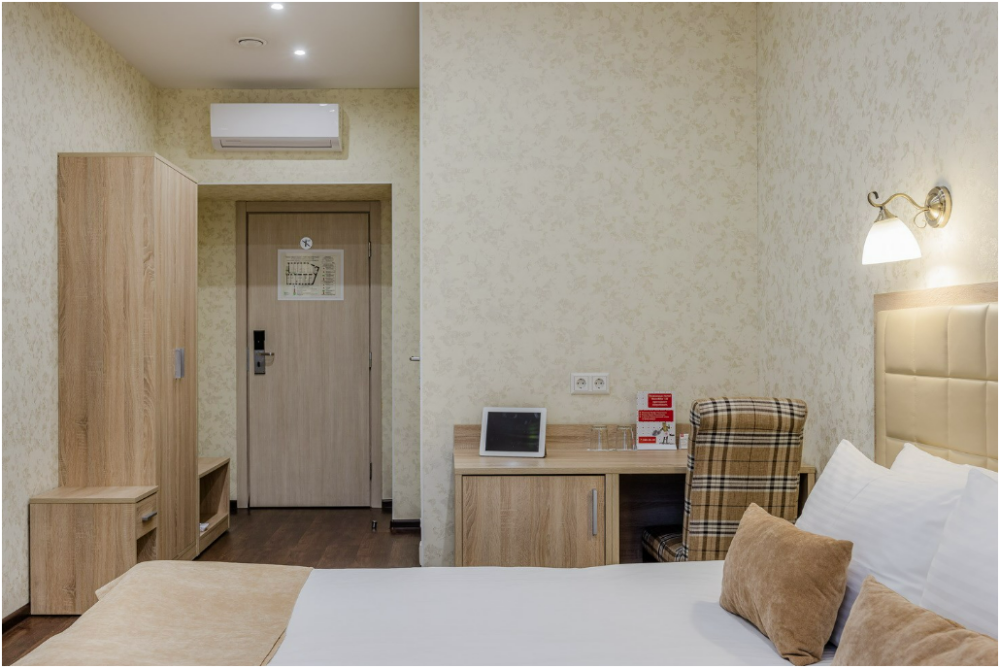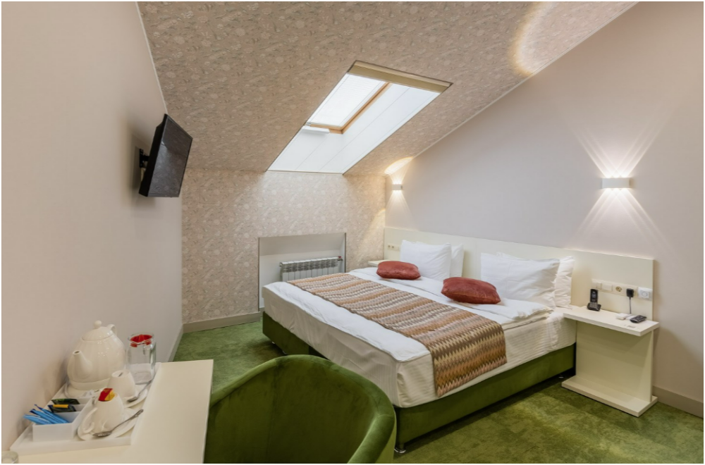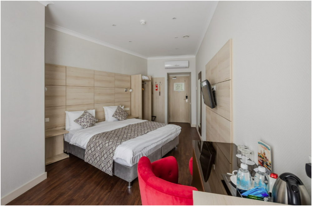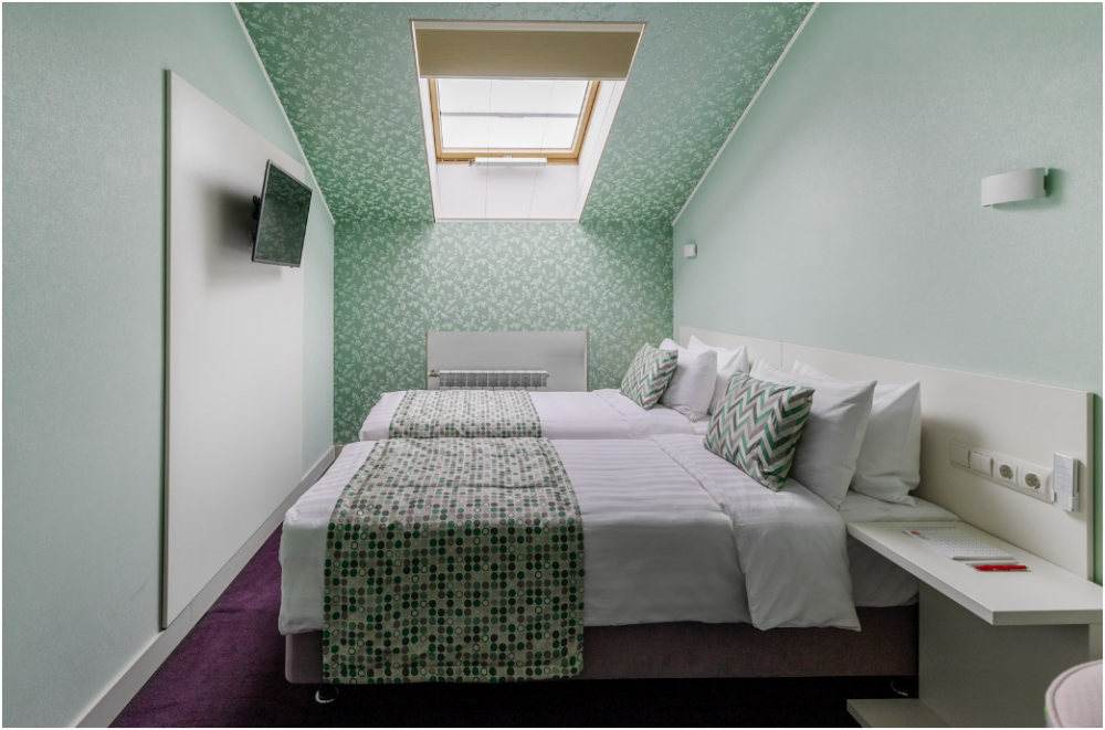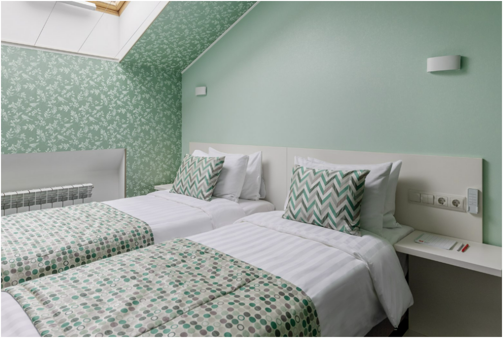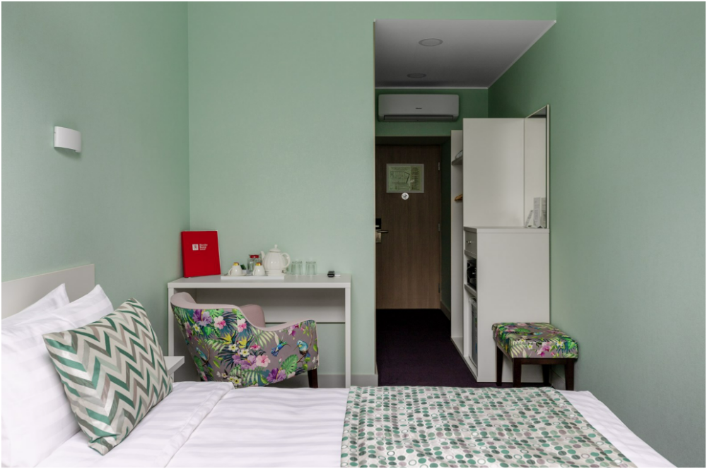 Уютные комнаты с двумя раздельными или двумя сдвинутыми кроватями. Площадь комнаты 12 м2 -15 м2. Номера располагаются преимущественно на четвертом и пятом этажах. На пятом этаже окна мансардные. В каждой комнате, специально для Вашего удобного проживания имеется: холодильник, телевизор, кондиционер, тумбочка, стулья, шкаф, тумба для багажа и бесплатный доступ к сети Wi-Fi.