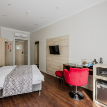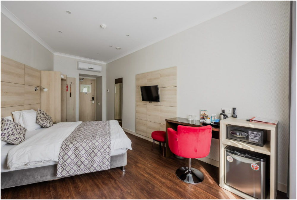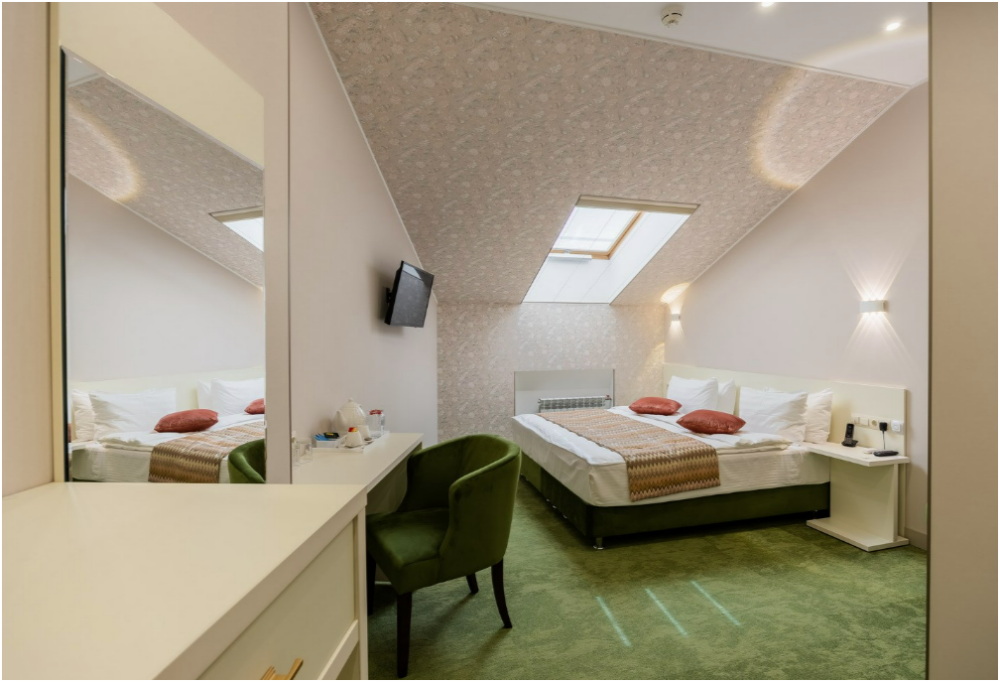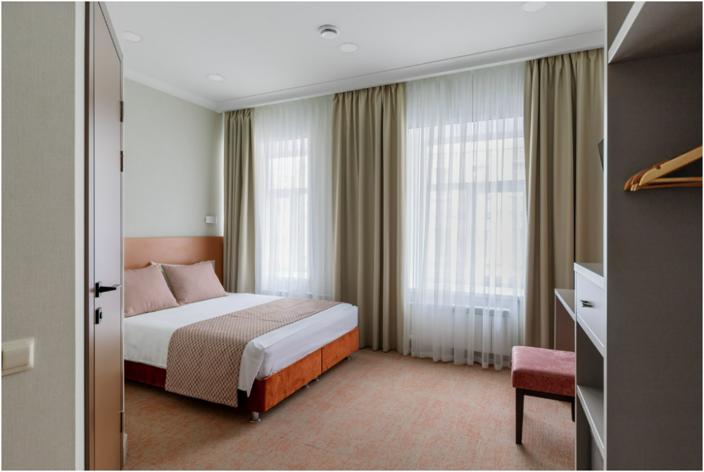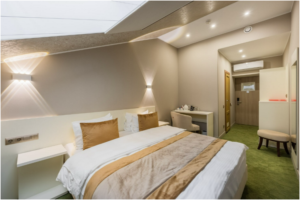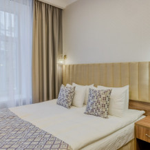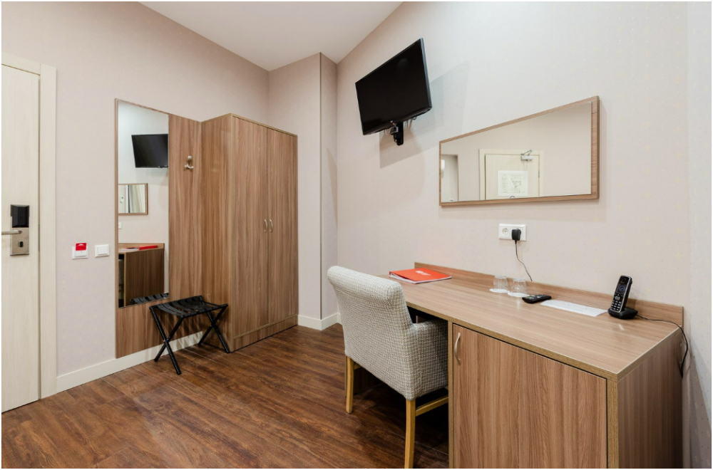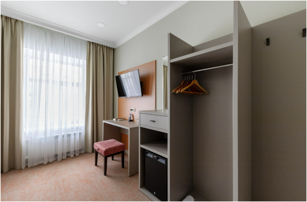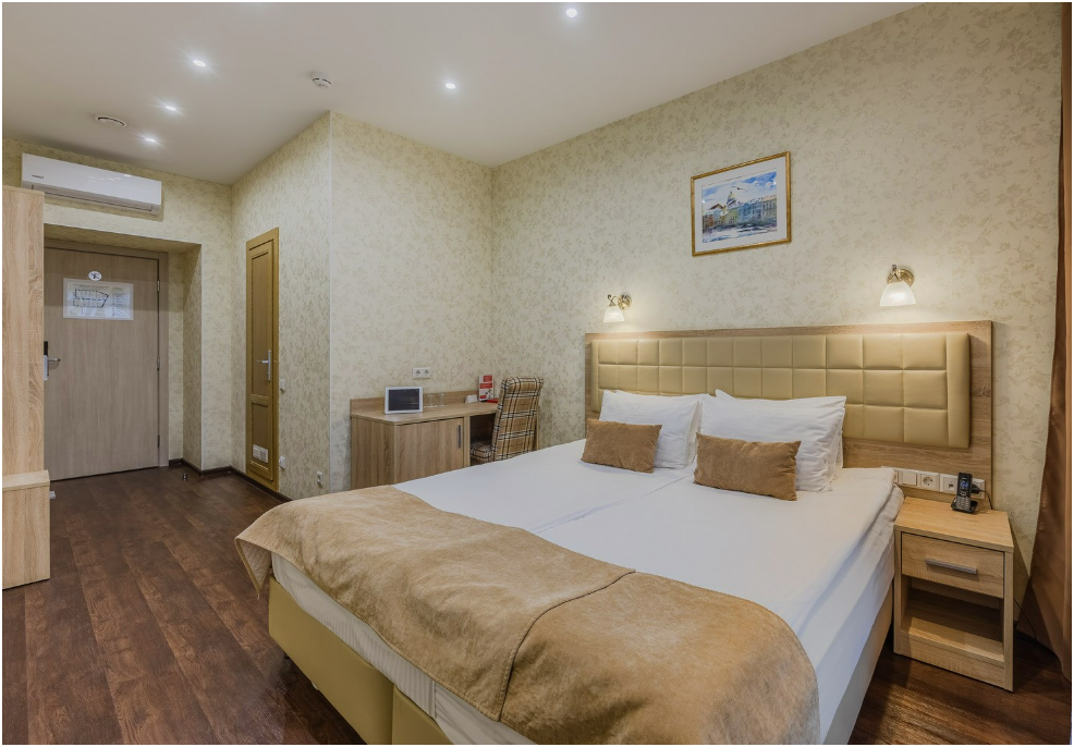 Уютные комнаты с двумя раздельными или двумя сдвинутыми кроватями. Площадь комнаты 12 м2 -15 м2. Номера располагаются преимущественно на четвертом и пятом этажах. На пятом этаже окна мансардные. В каждой комнате, специально для Вашего удобного проживания имеется: холодильник, телевизор, кондиционер, тумбочка, стулья, шкаф, тумба для багажа и бесплатный доступ к сети Wi-Fi.