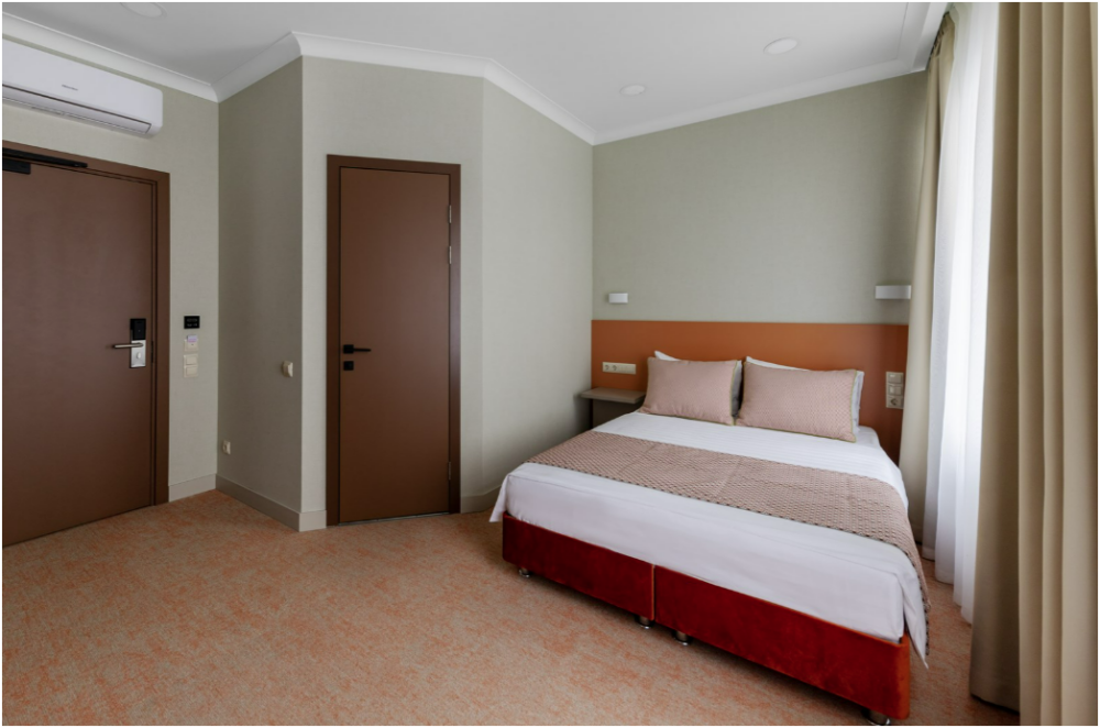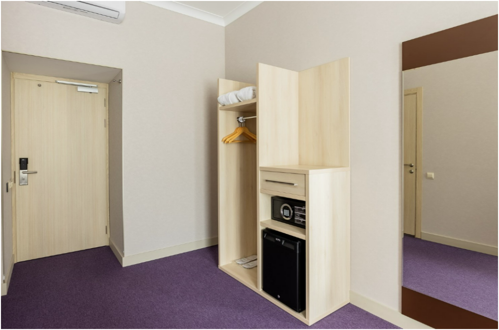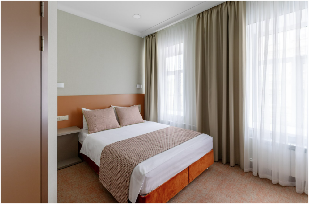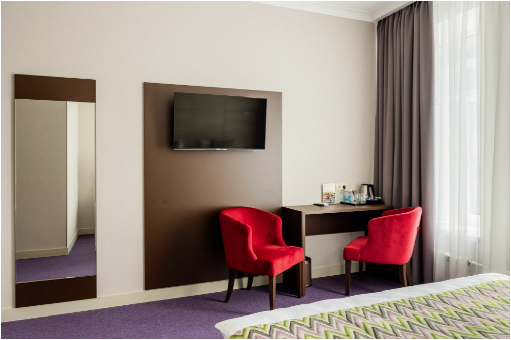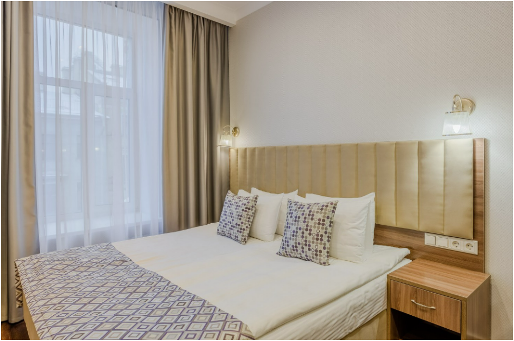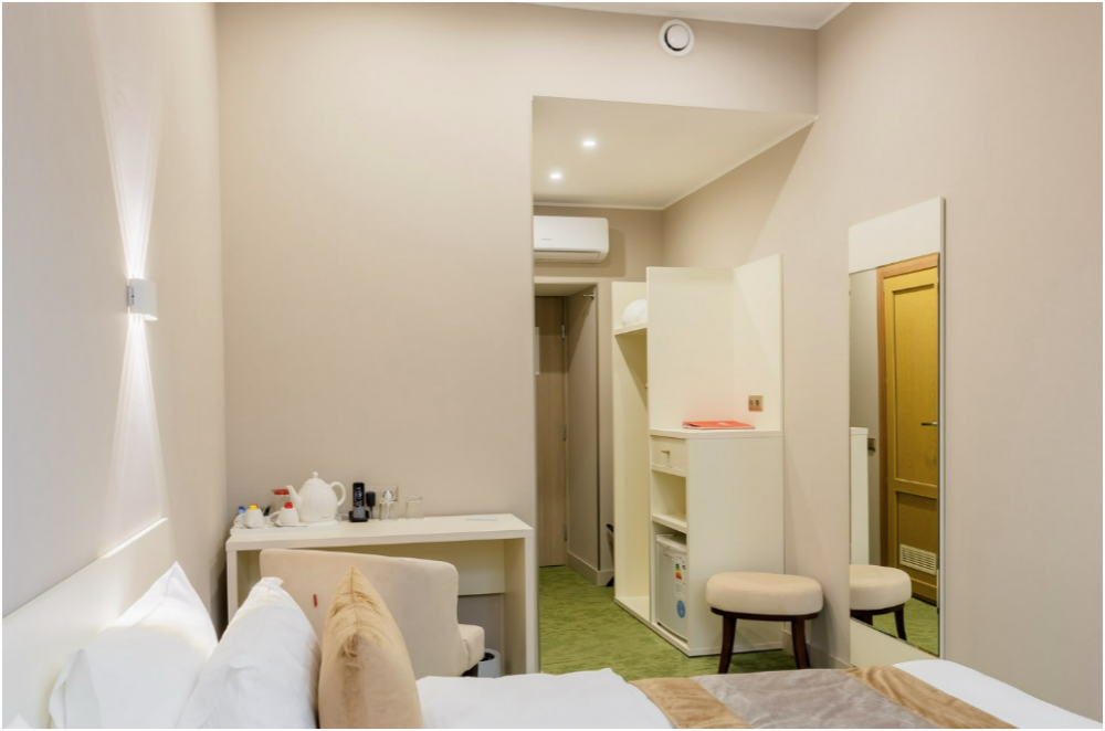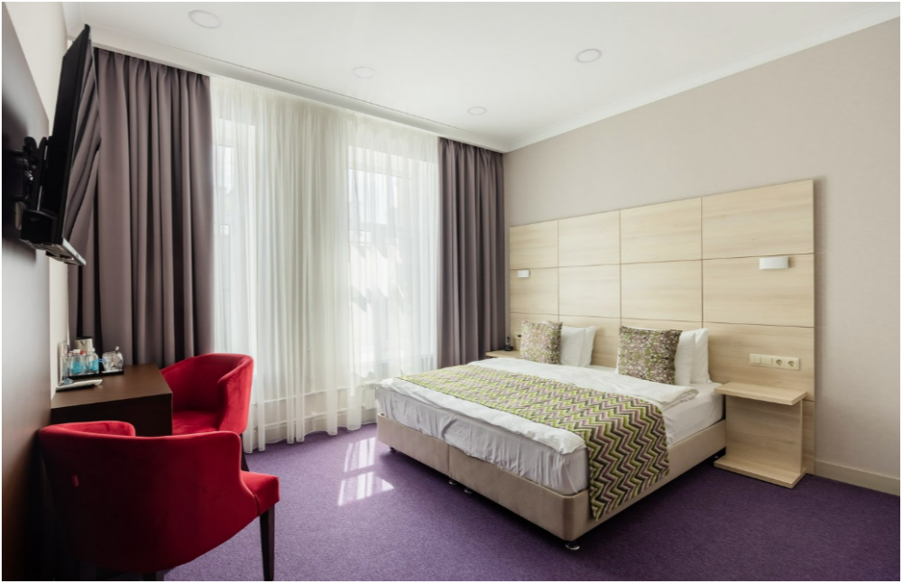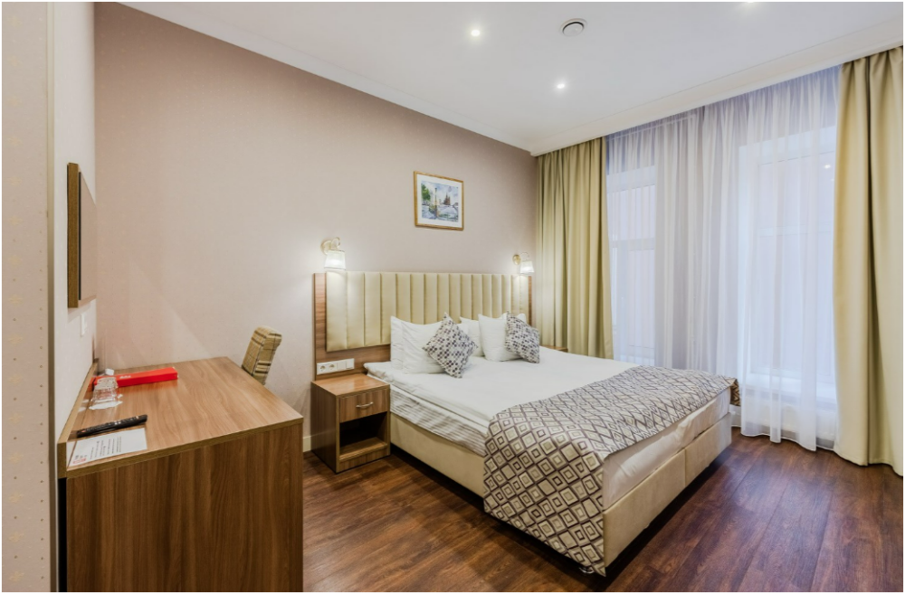 Уютные комнаты с двумя раздельными или двумя сдвинутыми кроватями. Площадь комнаты 12 м2 -15 м2. Номера располагаются преимущественно на четвертом и пятом этажах. На пятом этаже окна мансардные. В каждой комнате, специально для Вашего удобного проживания имеется: холодильник, телевизор, кондиционер, тумбочка, стулья, шкаф, тумба для багажа и бесплатный доступ к сети Wi-Fi.