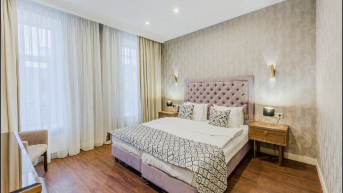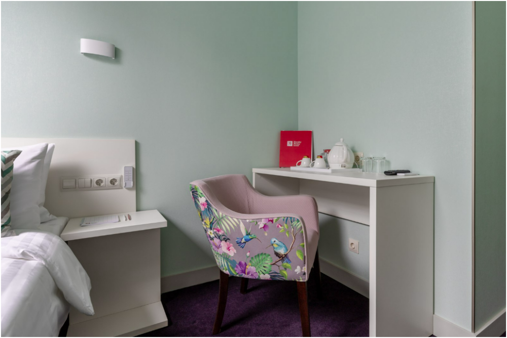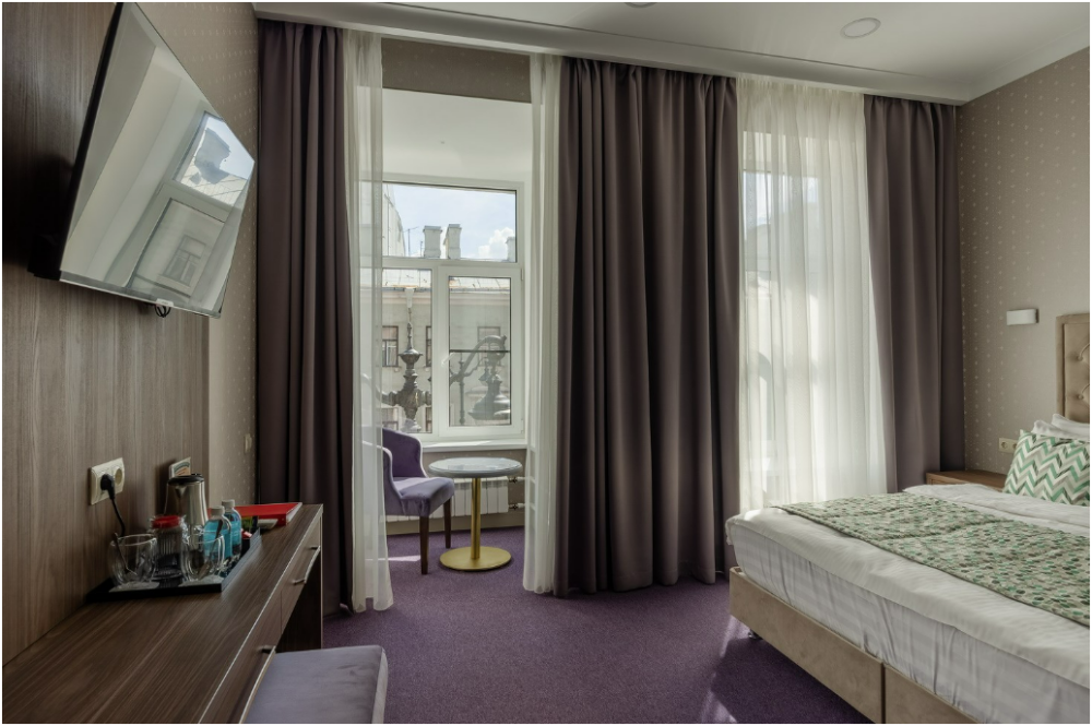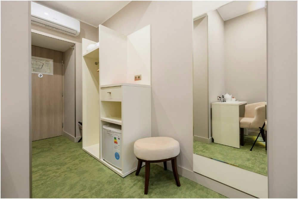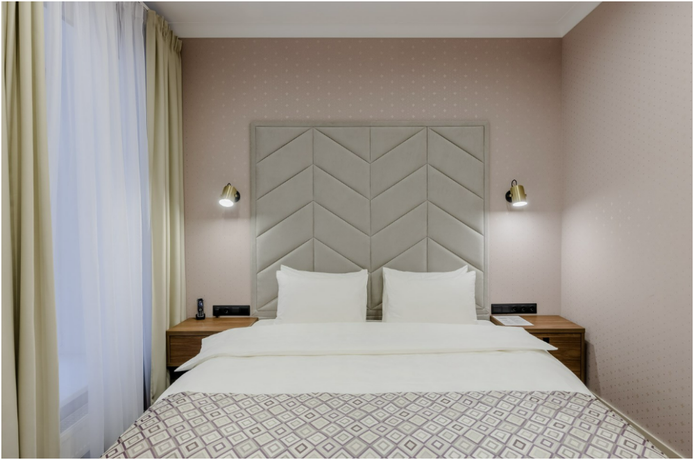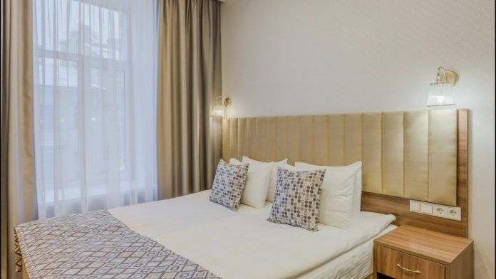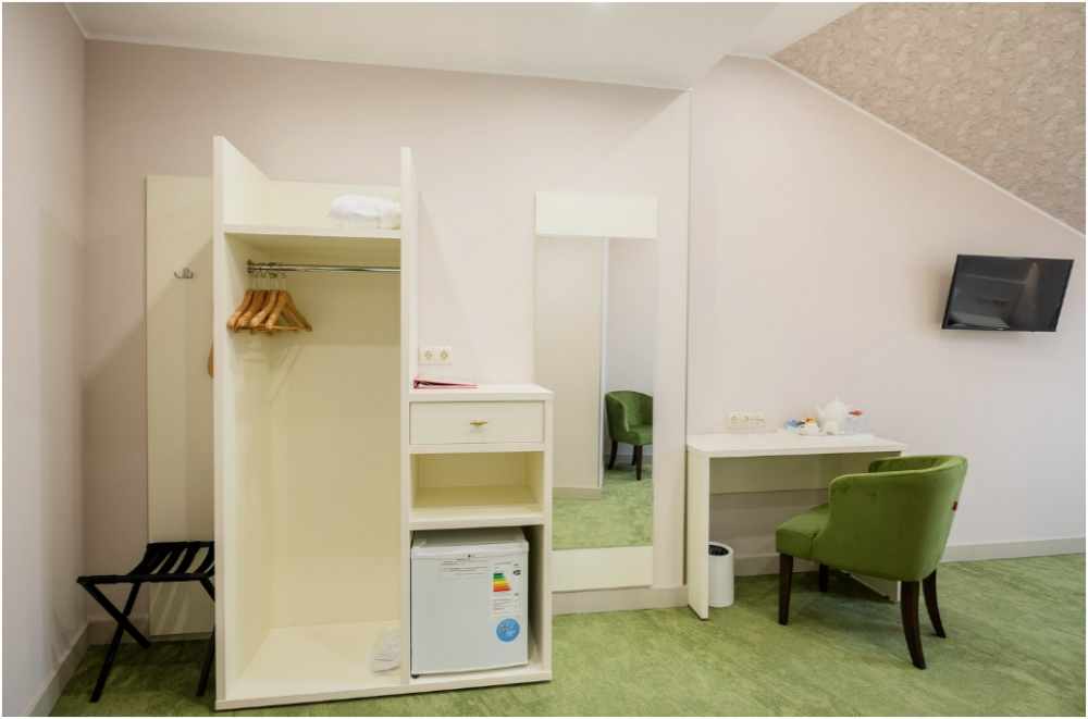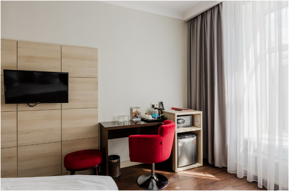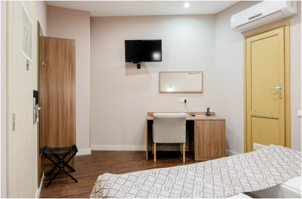 Уютные комнаты с двумя раздельными или двумя сдвинутыми кроватями. Площадь комнаты 12 м2 -15 м2. Номера располагаются преимущественно на четвертом и пятом этажах. На пятом этаже окна мансардные. В каждой комнате, специально для Вашего удобного проживания имеется: холодильник, телевизор, кондиционер, тумбочка, стулья, шкаф, тумба для багажа и бесплатный доступ к сети Wi-Fi.