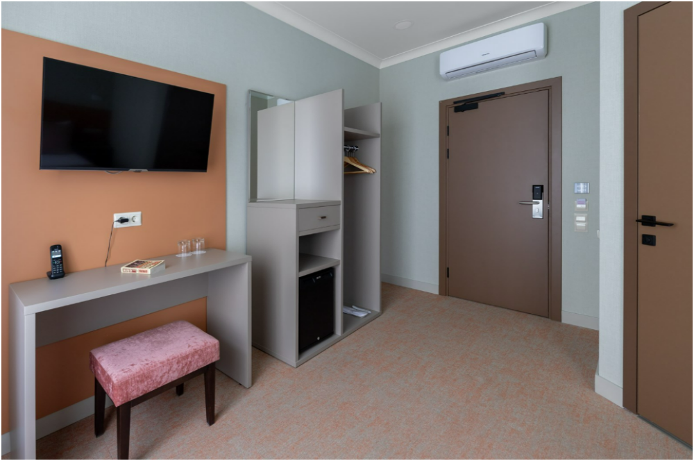 Оба номера оснащены всем необходимым для комфортного отдыха: удобные ортопедические матрасы, кондиционер, холодильник, чайная станция, набор косметики, халат, тапочки.