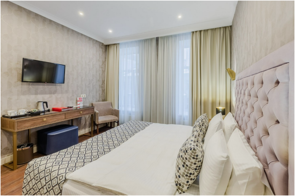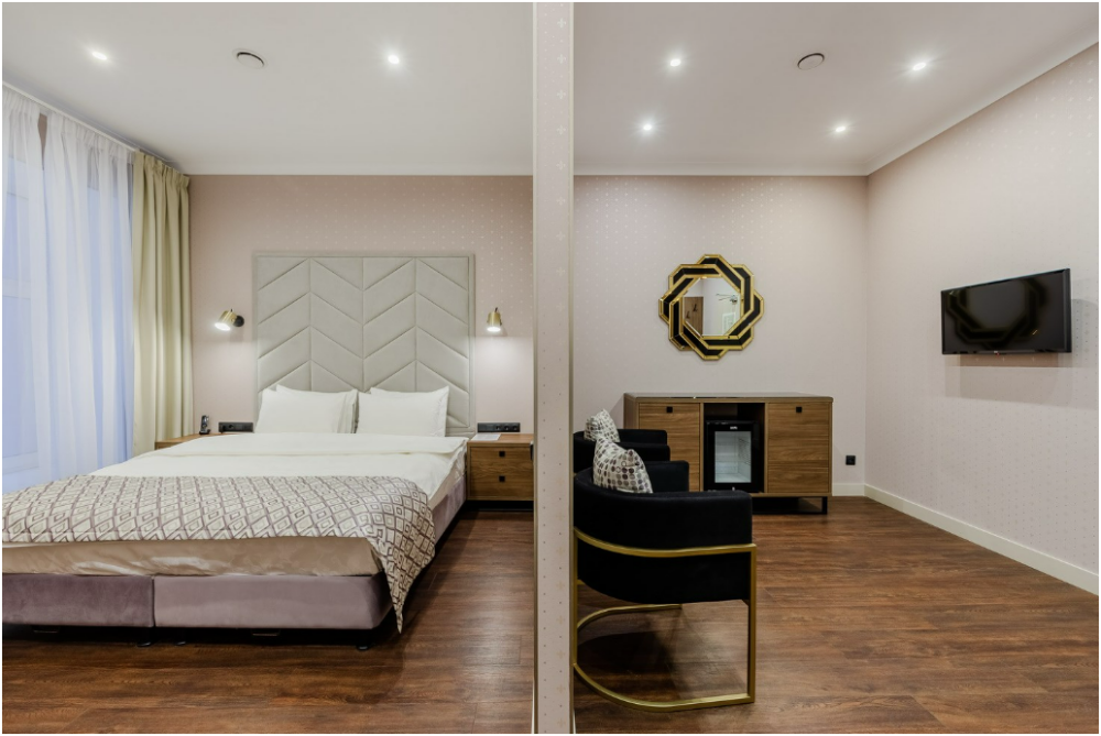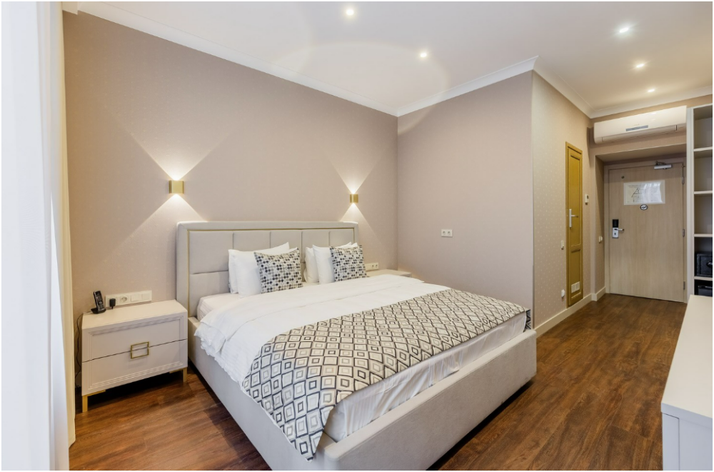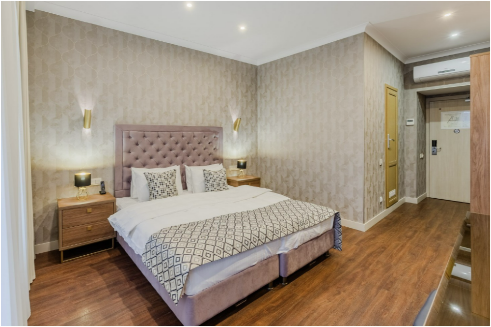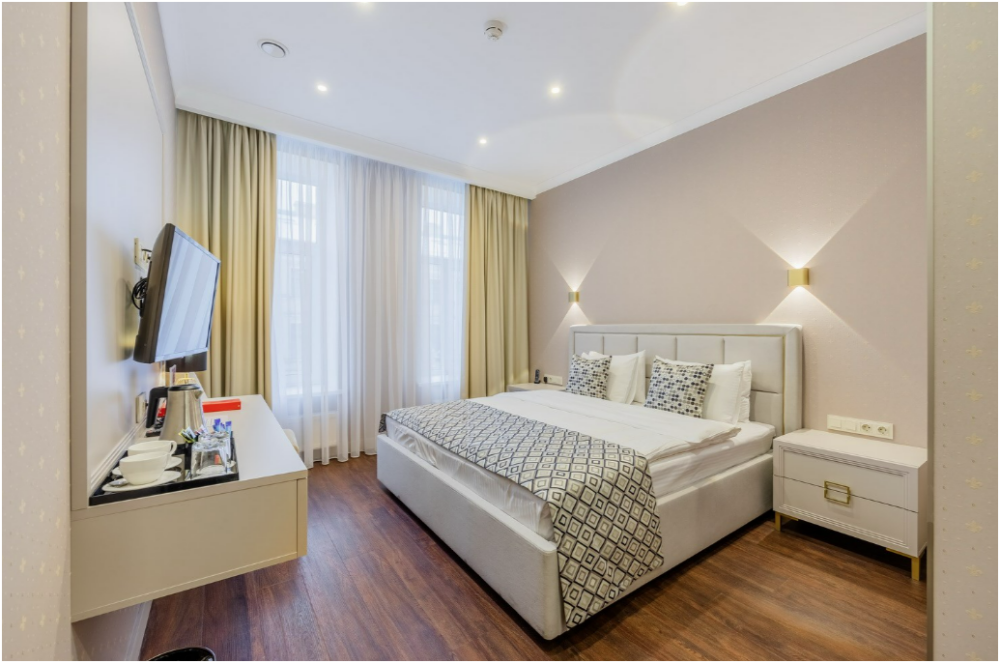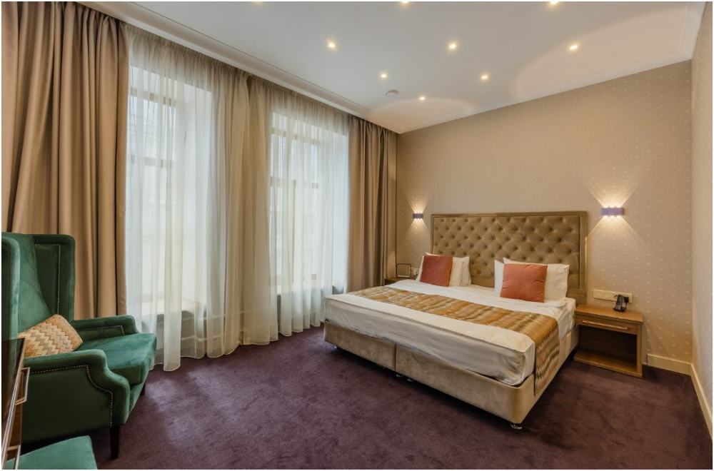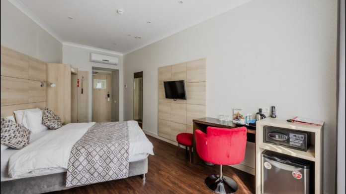 Уютные, просторные комнаты с одной большой кроватью. Площадь комнаты 25 м2 -32 м2. В каждой комнате, специально для Вашего удобного проживания в нашем отеле имеется: холодильник, телевизор, кондиционер, тумбочка, стулья, шкаф, тумба для багажа, журнальный столик, диван, сейф и бесплатный доступ к сети Wi-Fi. Бутилированная вода, чайная станция и кофемашина.