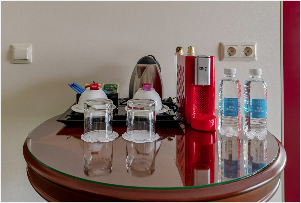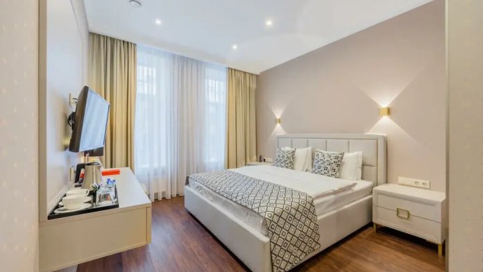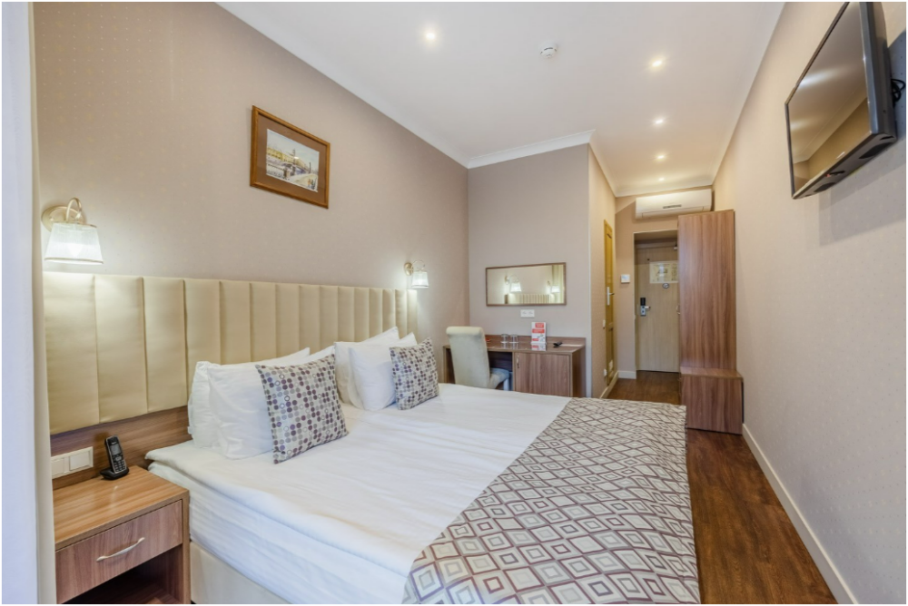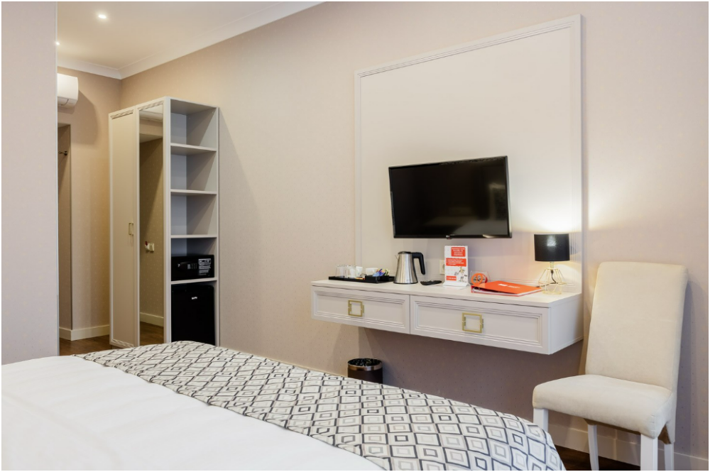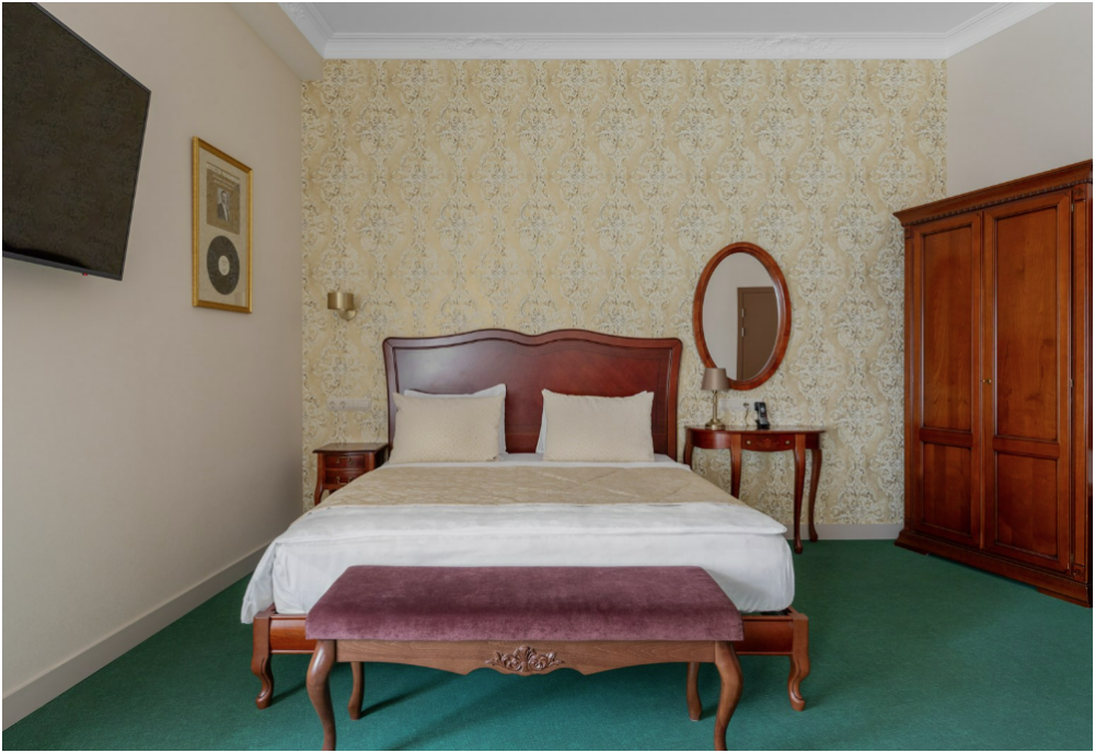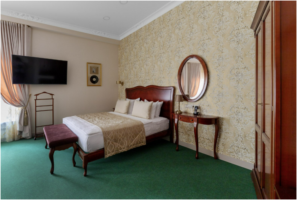 Уютные, просторные комнаты с одной большой кроватью. Площадь комнаты 25 м2 -32 м2. В каждой комнате, специально для Вашего удобного проживания в нашем отеле имеется: холодильник, телевизор, кондиционер, тумбочка, стулья, шкаф, тумба для багажа, журнальный столик, диван, сейф и бесплатный доступ к сети Wi-Fi. Бутилированная вода, чайная станция и кофемашина.