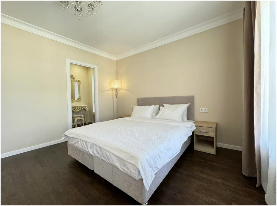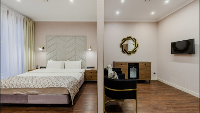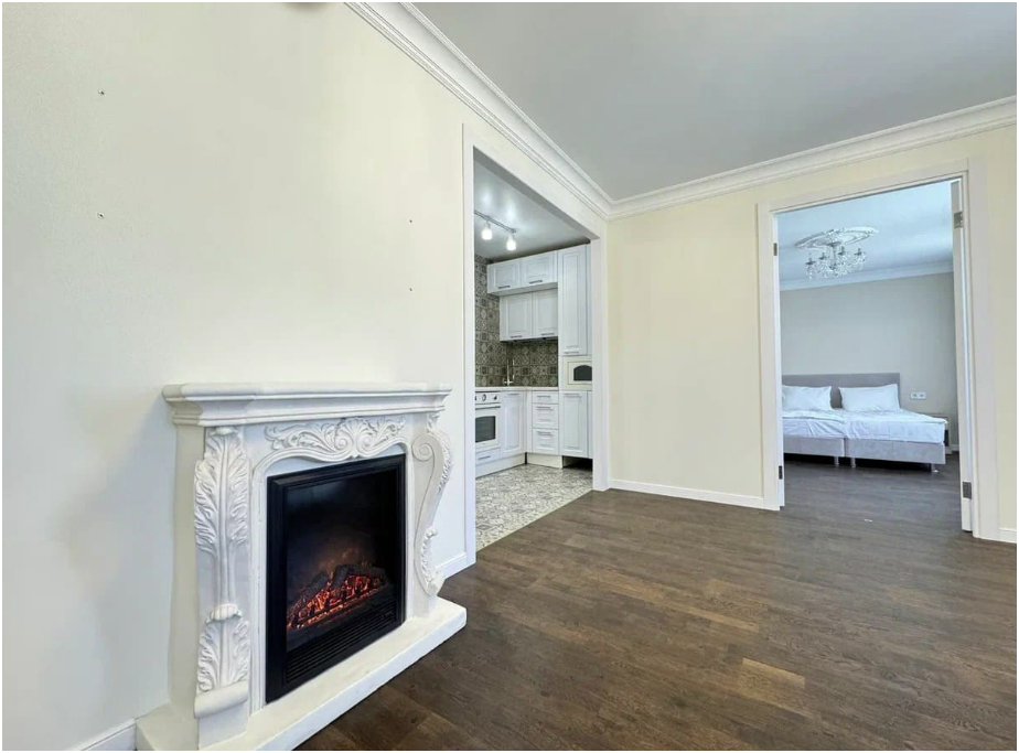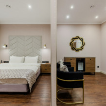 Просторное помещение с современным дизайном и уютной обстановкой. В номере есть несколько комнат: отдельная спальня с собственной гардеробной, оснащенная всем необходимым кухня, гостиная с собственным электрическим камином, большая прихожая. Идеальная и просторная атмосфера для отдыха. Выбирая этот номер Вы включаете в Ваш отдых все удобства обычной жизни и возможность почувствовать себя как дома.