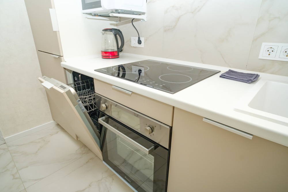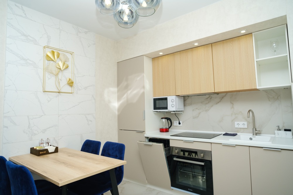 Кухонная зона: полностью оборудована: посудомоечная машина, плита, холодильник, микроволновка, чайник, духовой шкаф и турка. Есть вся необходимая посуда и столовые приборы.