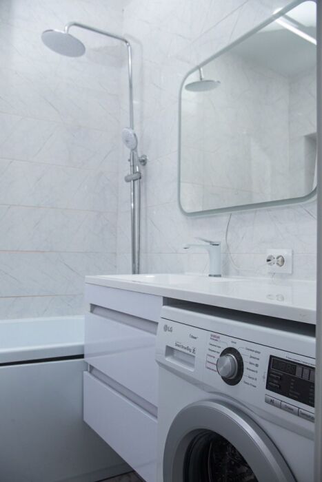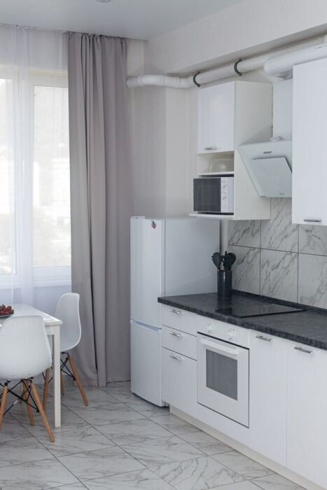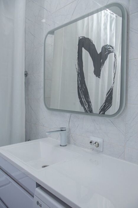 Удобства: бесплатный Wi-Fi, телевизор с бесплатными кинотеатрами и телевидением, кондиционер, тёплый пол, стиральная машина, утюг, фен.