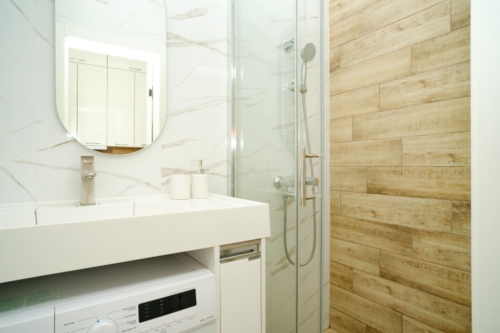 Ванная комната (совмещенная): душ, раковина и туалет.