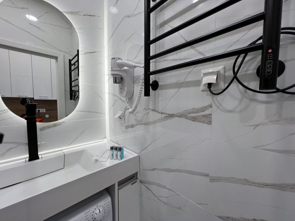 Внимание! Комплекс был недавно сдан, и администрация города еще не успела полностью подвести электромощности. В связи с этим на каждую квартиру выделяется 10 ампер электричества. Это означает, что Вы можете включить одновременно не более трех электроприборов, не считая тех, что уже работают постоянно (холодильник, бойлер и другие встроенные системы).