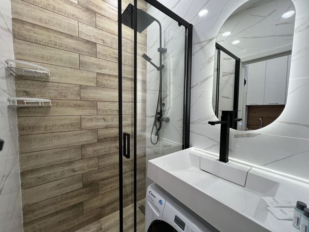 Ванная комната (совмещенная): душ, раковина и туалет.