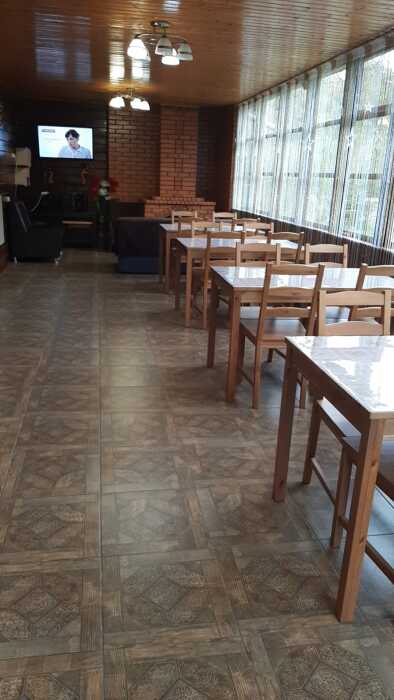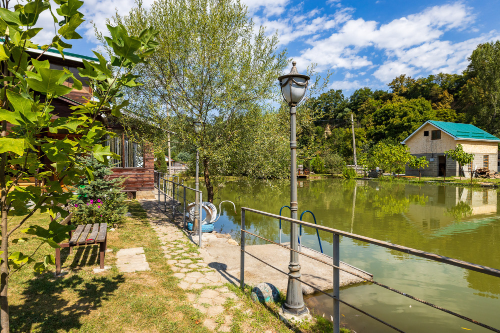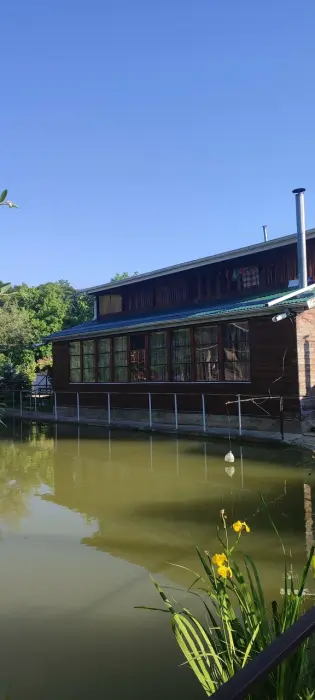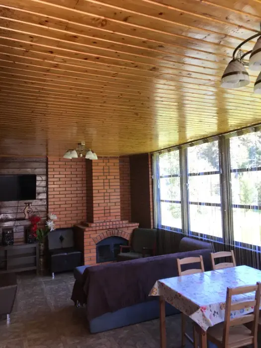 Имеется оборудованная кухня, большой зал-столовая. В кухне есть все необходимое для самостоятельного приготовления пищи (газовая плита, микроволновка, 2 больших холодильника, посуда). На территории беседки, мангальные зоны, баня, бассейн. Рыбалка за отдельную плату.