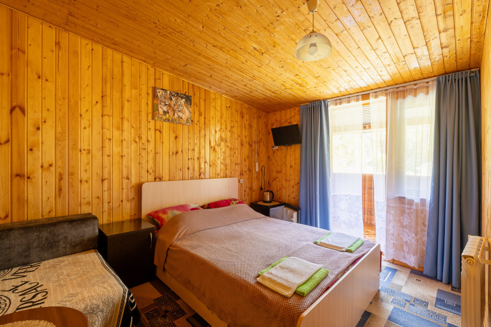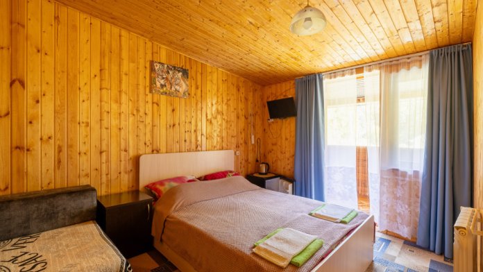 Двухэтажный дом, в доме 7 изолированных 2-местных комнат со всеми удобствами с балконами. В номере есть мини-холодильник, чайник, телевизор. Дом можно арендовать полностью, этажами и комнатами.