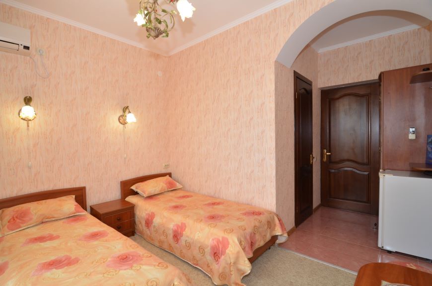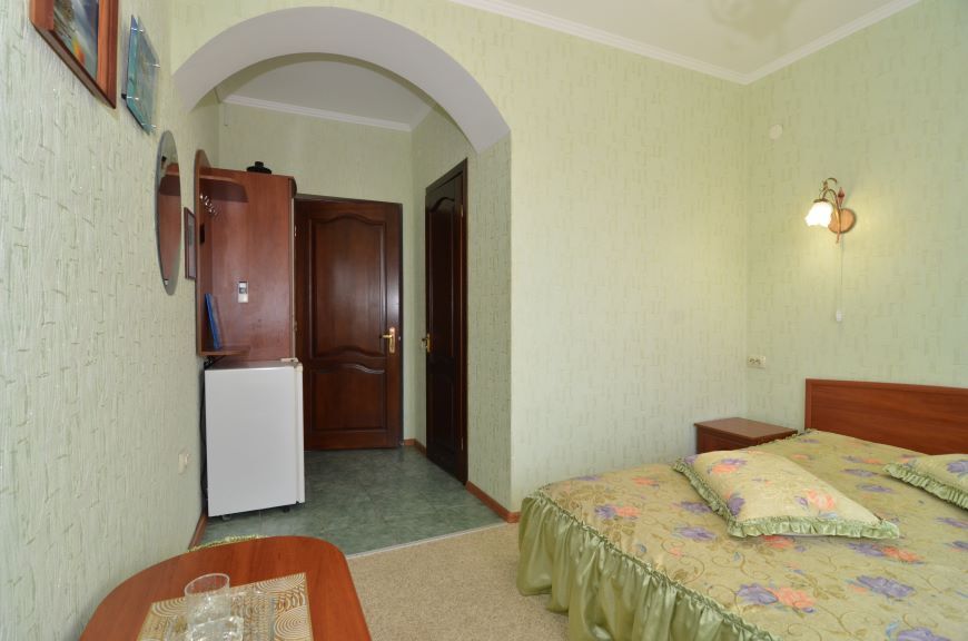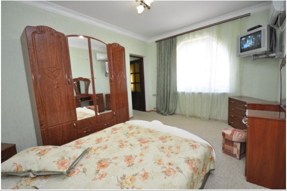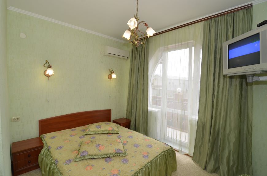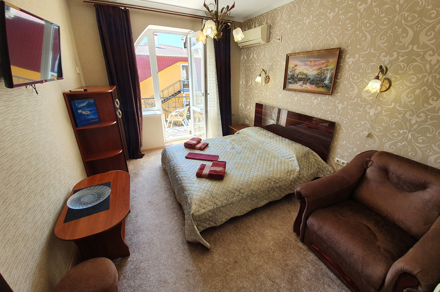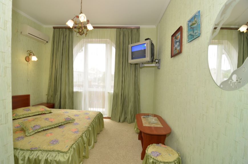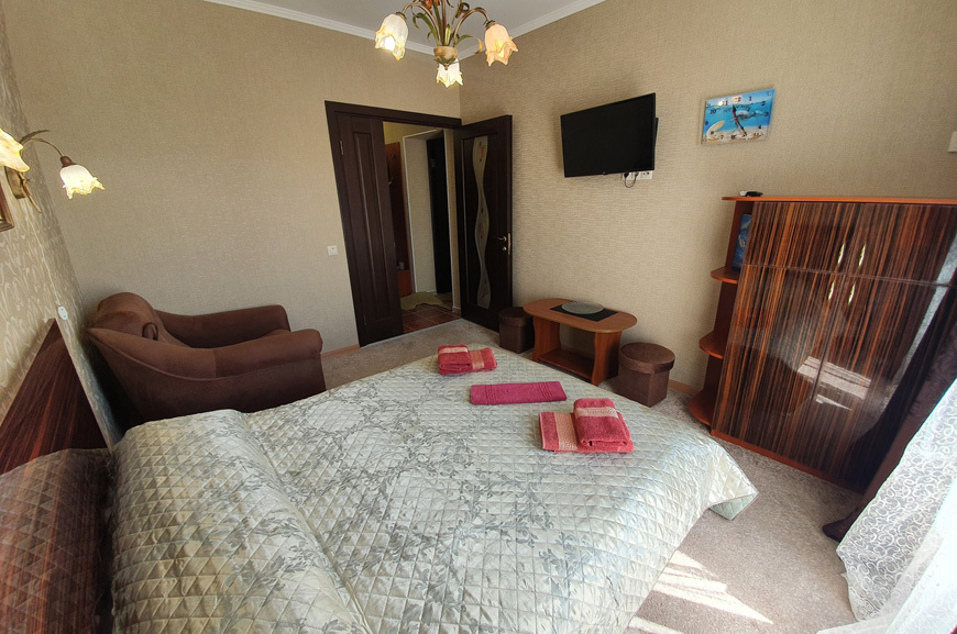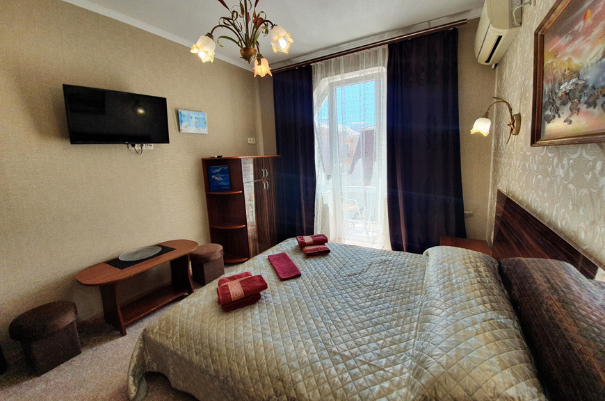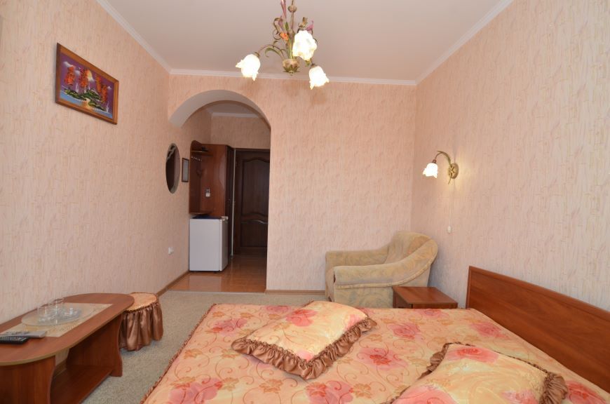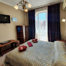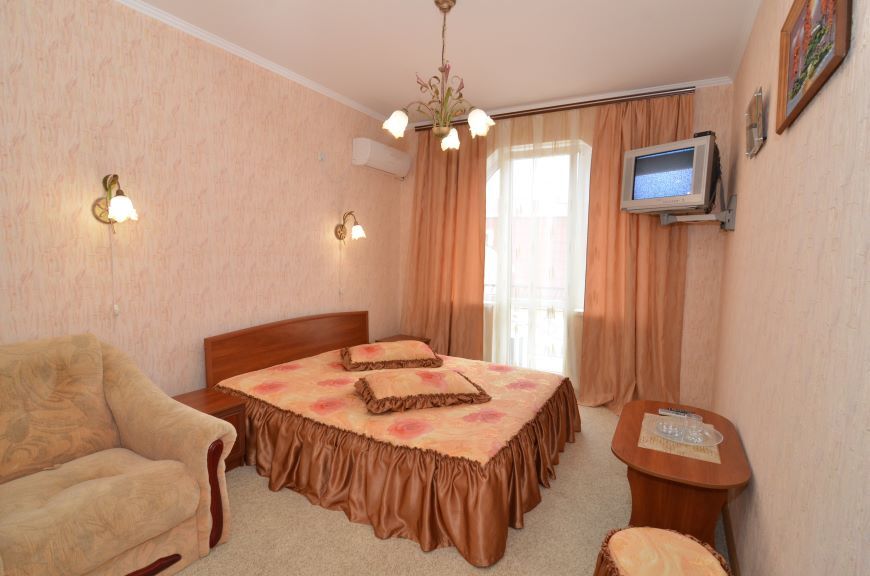 В номере: кровать двуспальная или 2 односпальные, прикроватные тумбочки, мягкое кресло, столик, 2 стула, шкафчик, комплект полотенец, мыльные принадлежности, бойлер, ТВ 95 каналов, смена белья 1 раз в неделю.