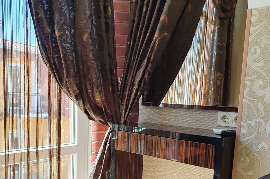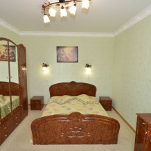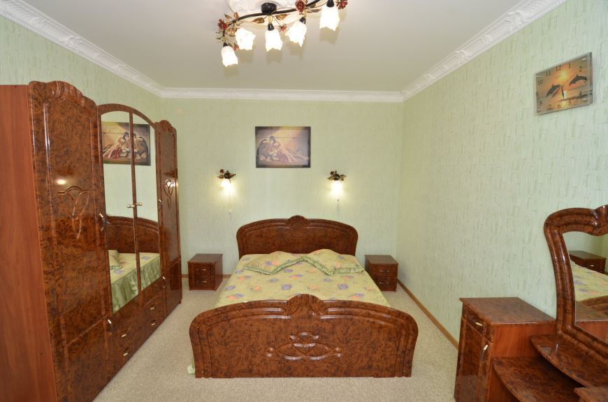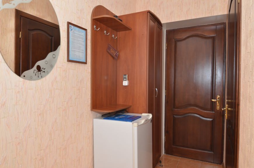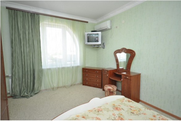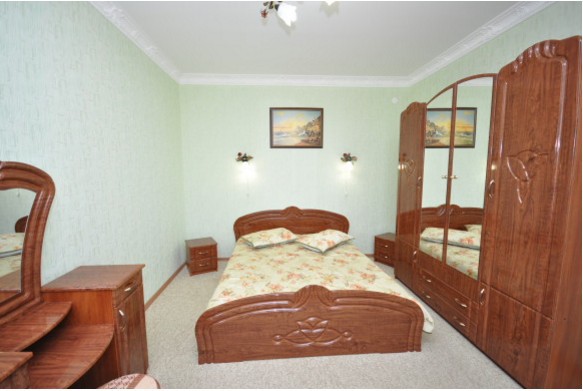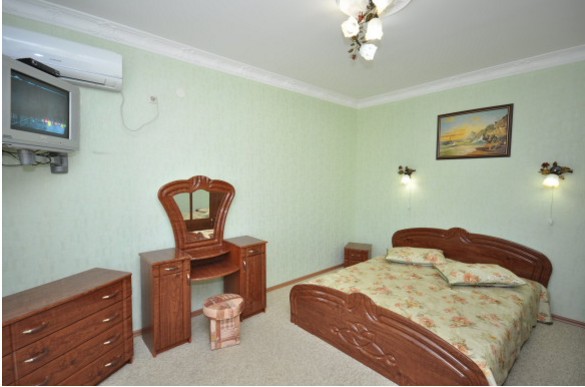 В номере: прикроватные тумбочки, шкаф для одежды с зеркалом, туалетный столик, комод, мягкое кресло, столик, пуфик, шкаф, санузел оборудован современной сантехникой с душевой кабиной, теплую воду обеспечивает бойлер, комплект полотенец, мыльные принадлежности; смена постельного белья 1 раз в неделю.