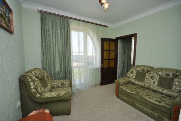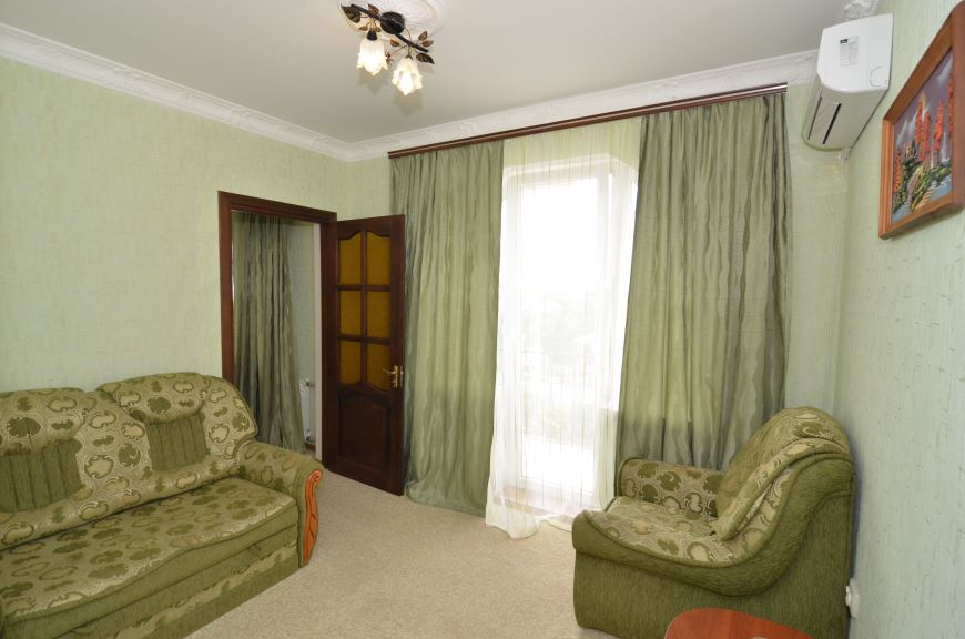 Во второй комнате есть раскладные диван и кресла, столик, шкаф для одежды, холодильник, спутниковое ТВ с 95 каналами, кондиционер. Из этой комнаты можно выйти на балкон.