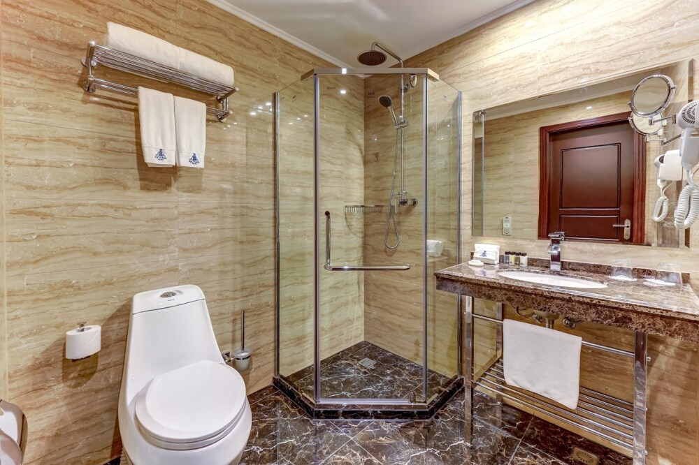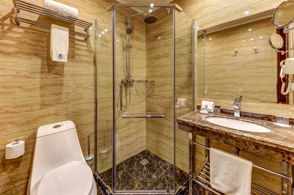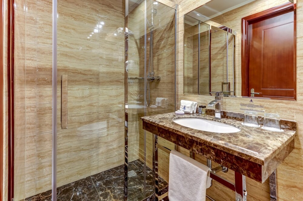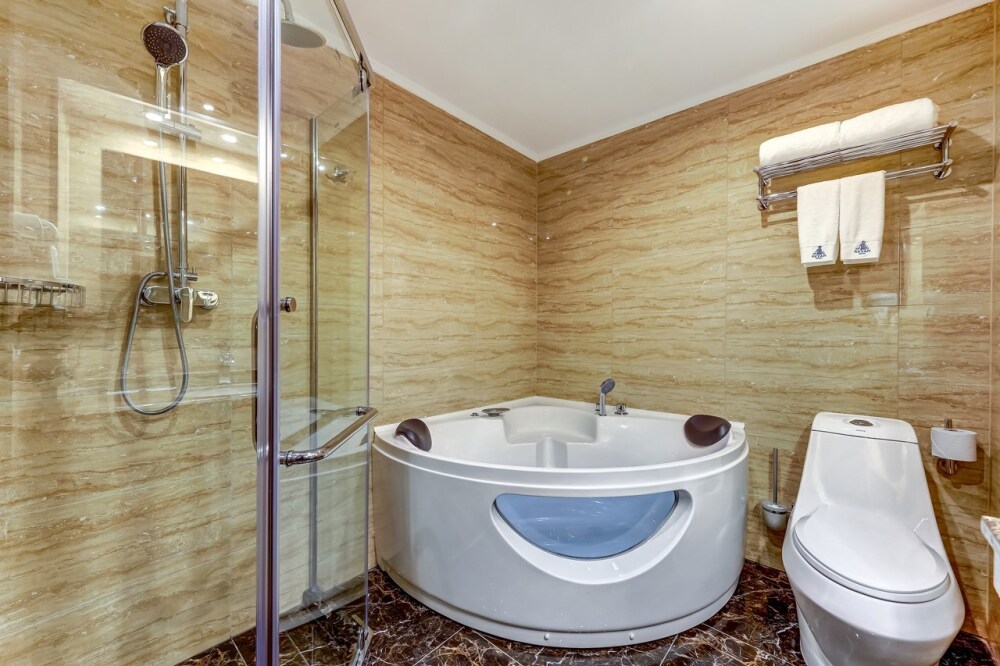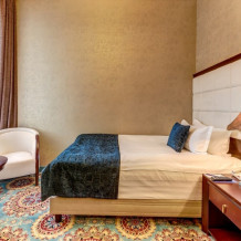 Просторный двухкомнатный номер, площадь которого составляет 50 кв.м., что позволяет с комфортом разместиться большой семье. Номер состоит из гостиной и спальной комнаты, ванная комната оборудована джакузи.