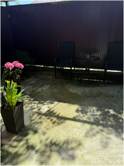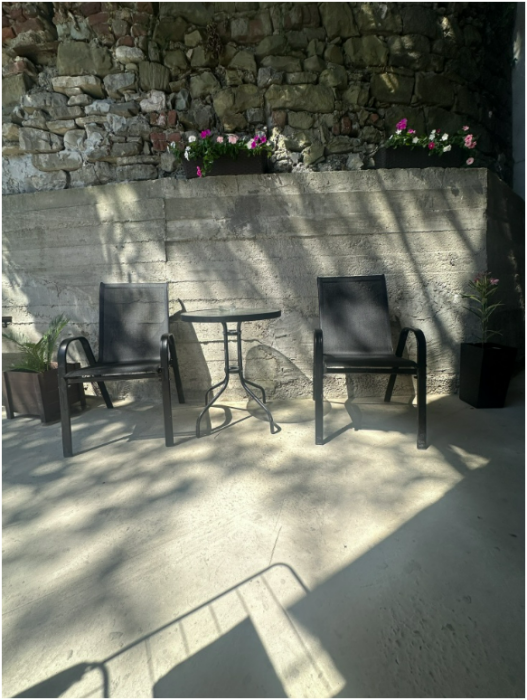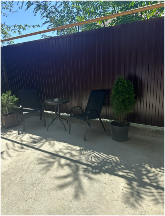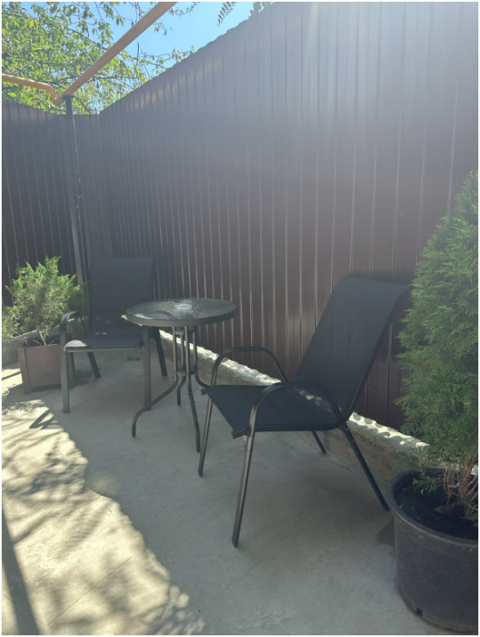 Есть небольшой дворик с мангалом и садовой мебелью.