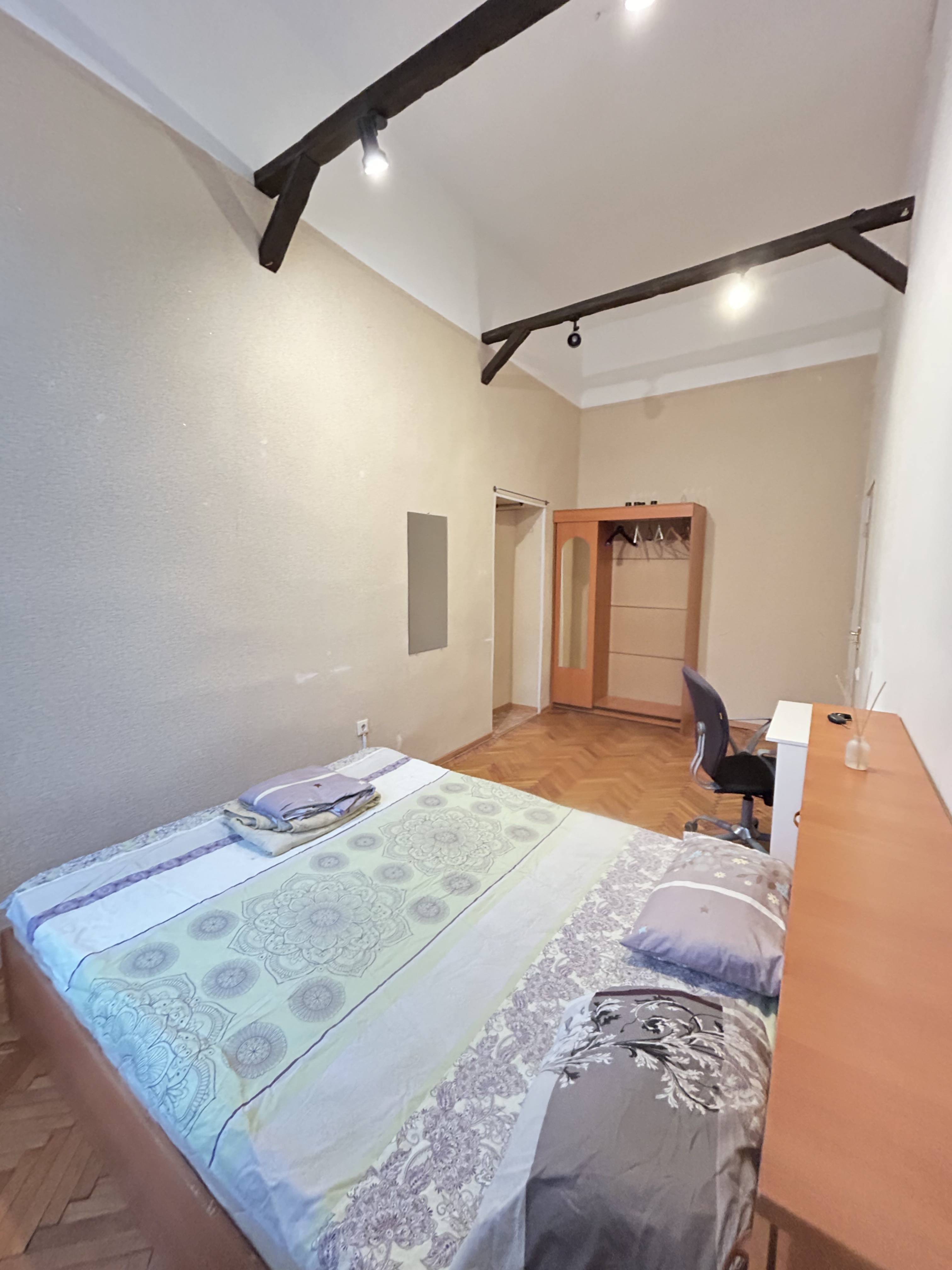 В комнате двуспальная кровать, комод, вешалка напольная, письменный стол и стул. Чистое постельное белье и полотенца.