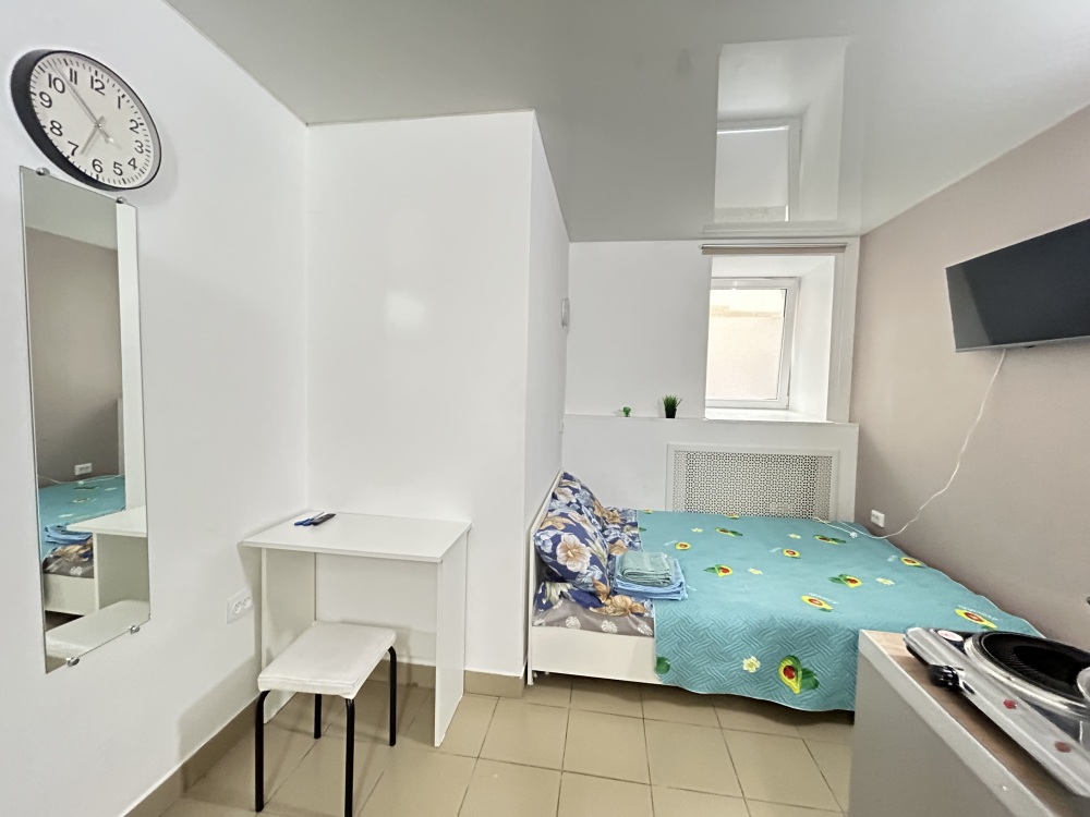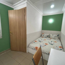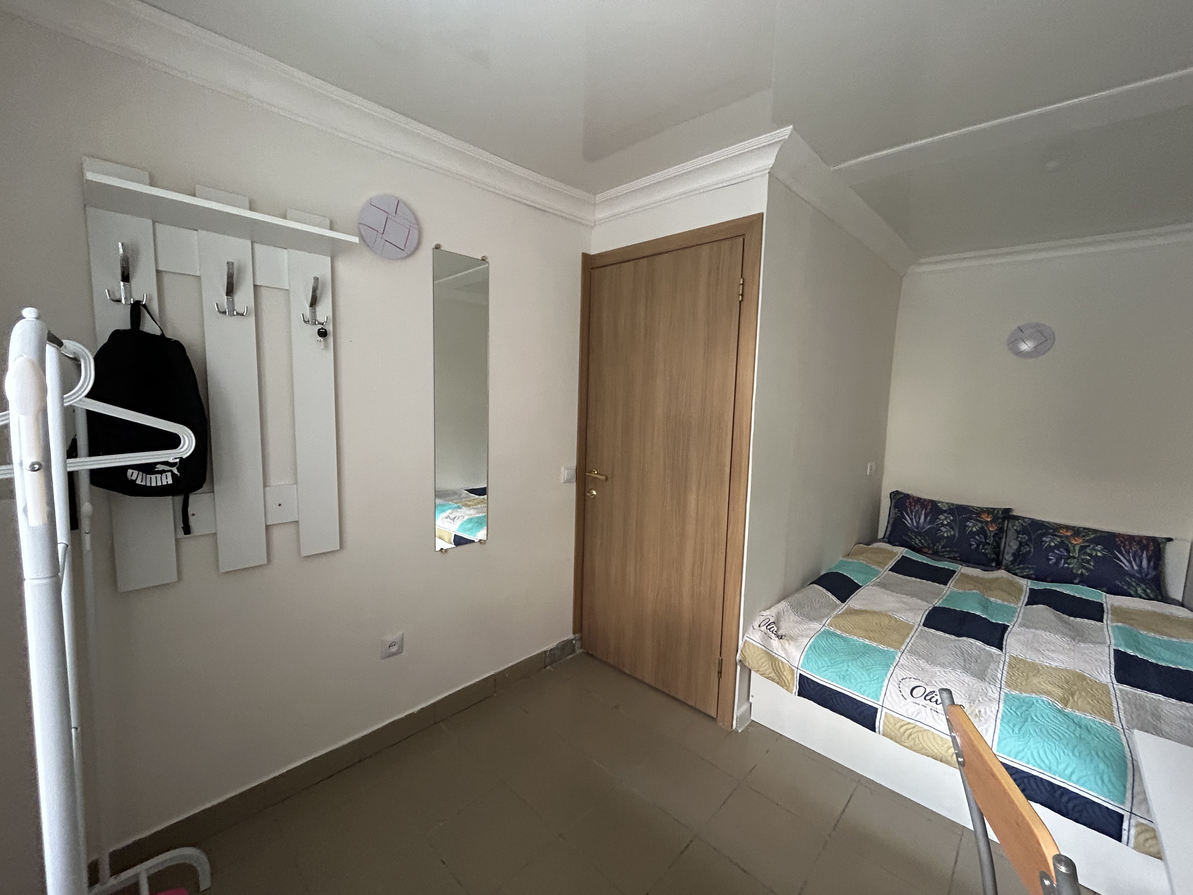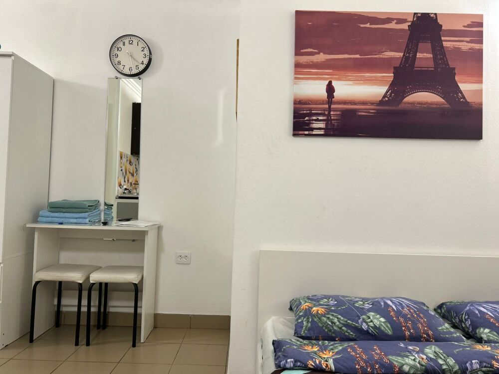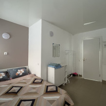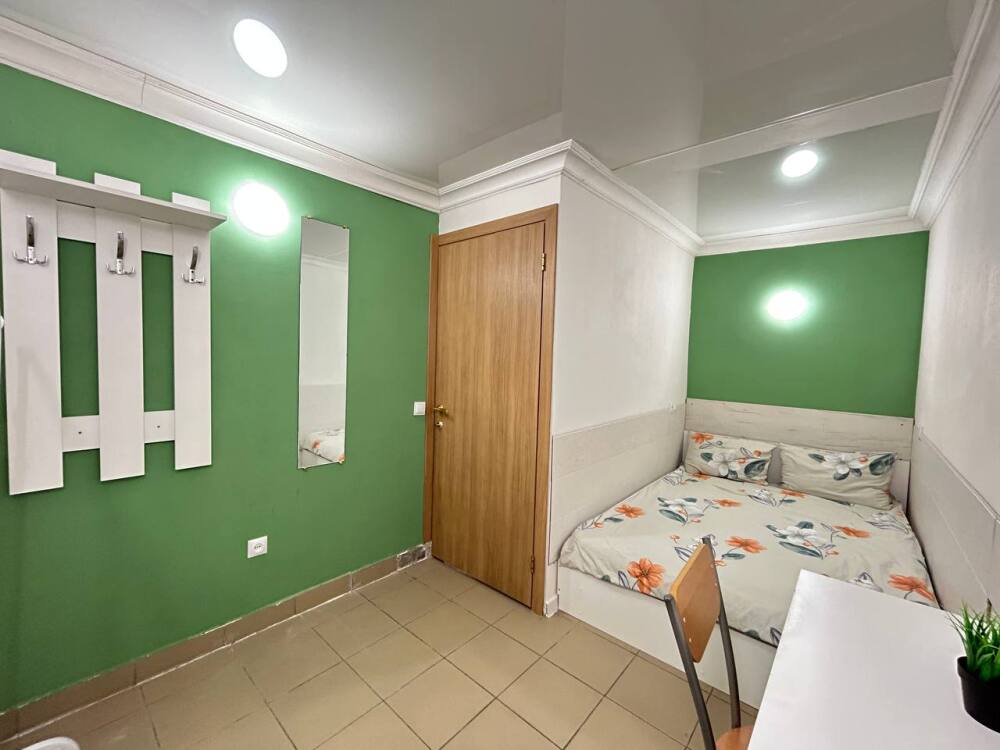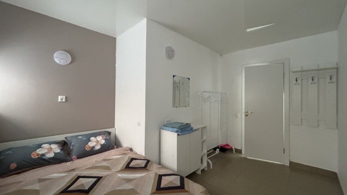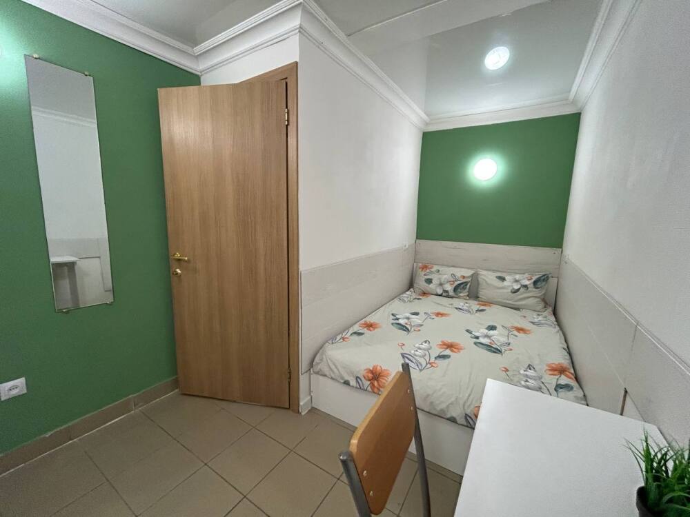 В комнате вас ждёт всё необходимое: удобная двуспальная кровать, комод для вещей, вешалка, стол и стул для работы или отдыха. Мы позаботились о мелочах: вас будут ждать свежее постельное бельё и чистые полотенца.