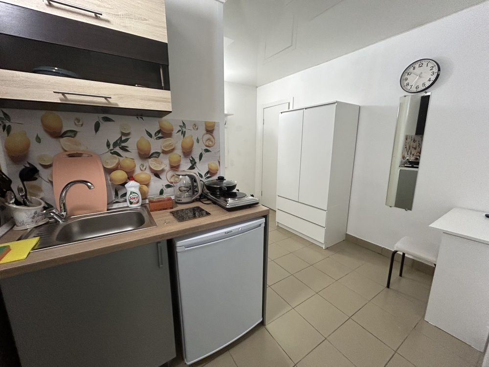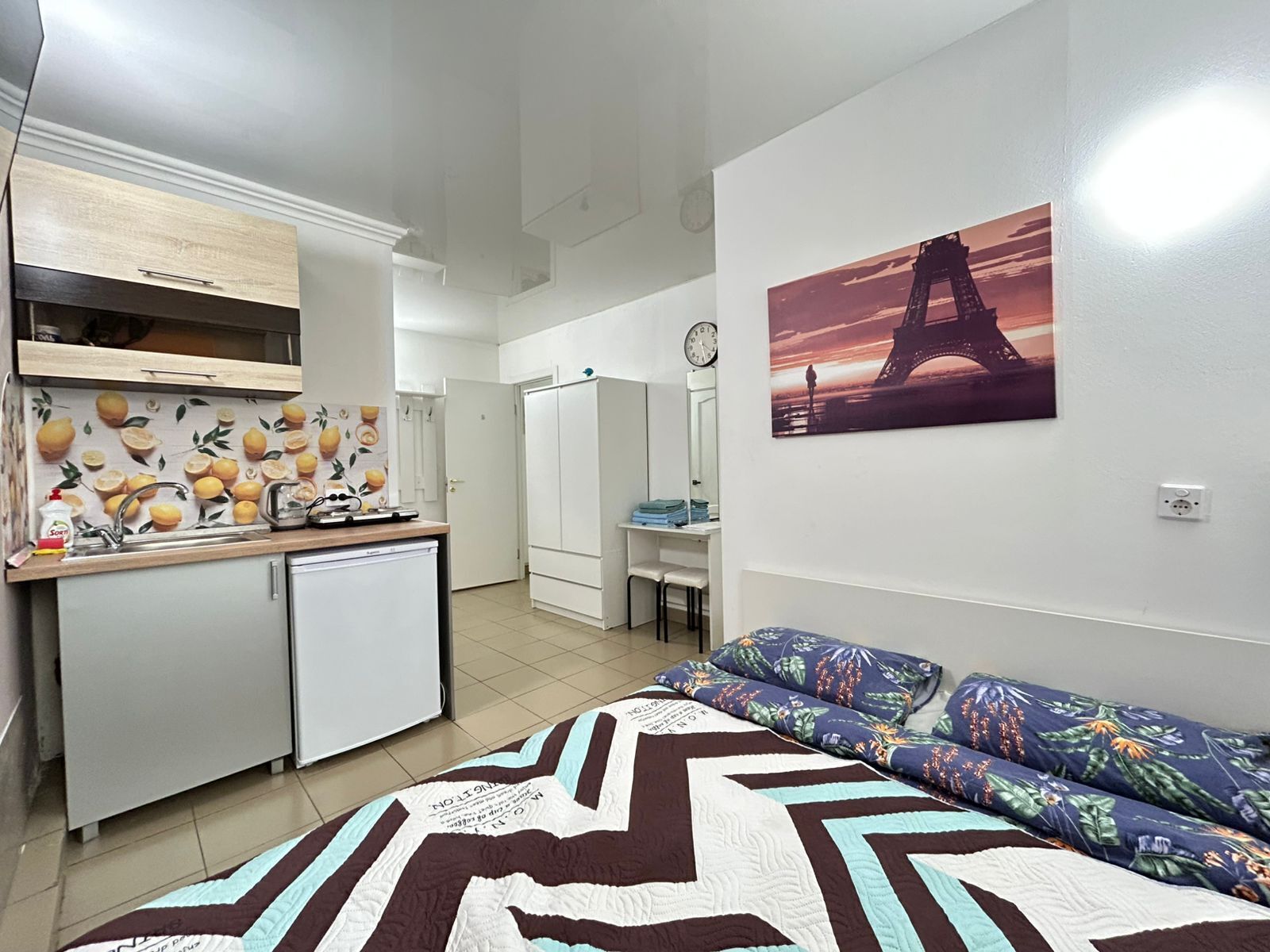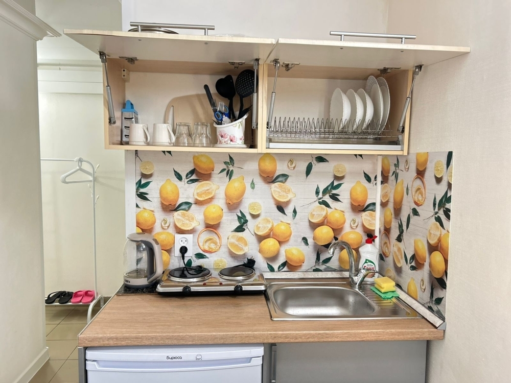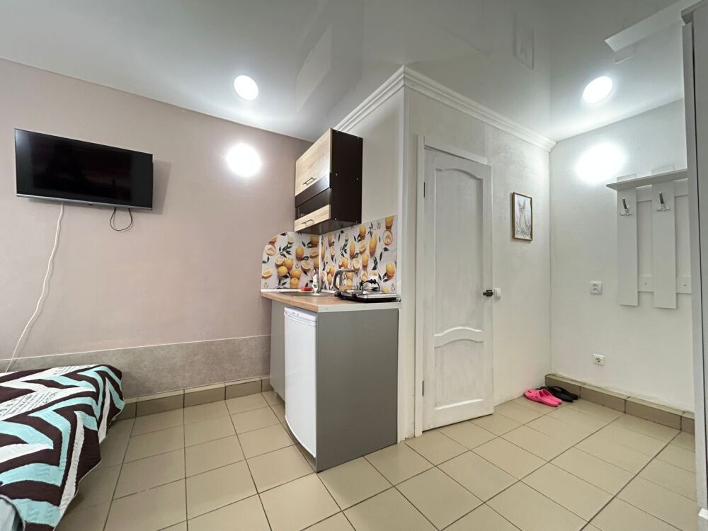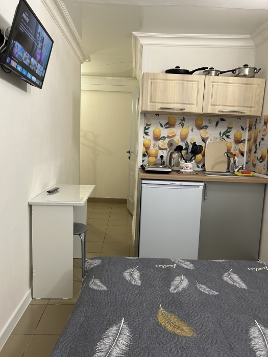 Номер с собственным санузлом и кухней. Посуда, фен, утюг, постельные принадлежности и полотенца, шампунь, гель и чай есть все для спокойного отдыха.