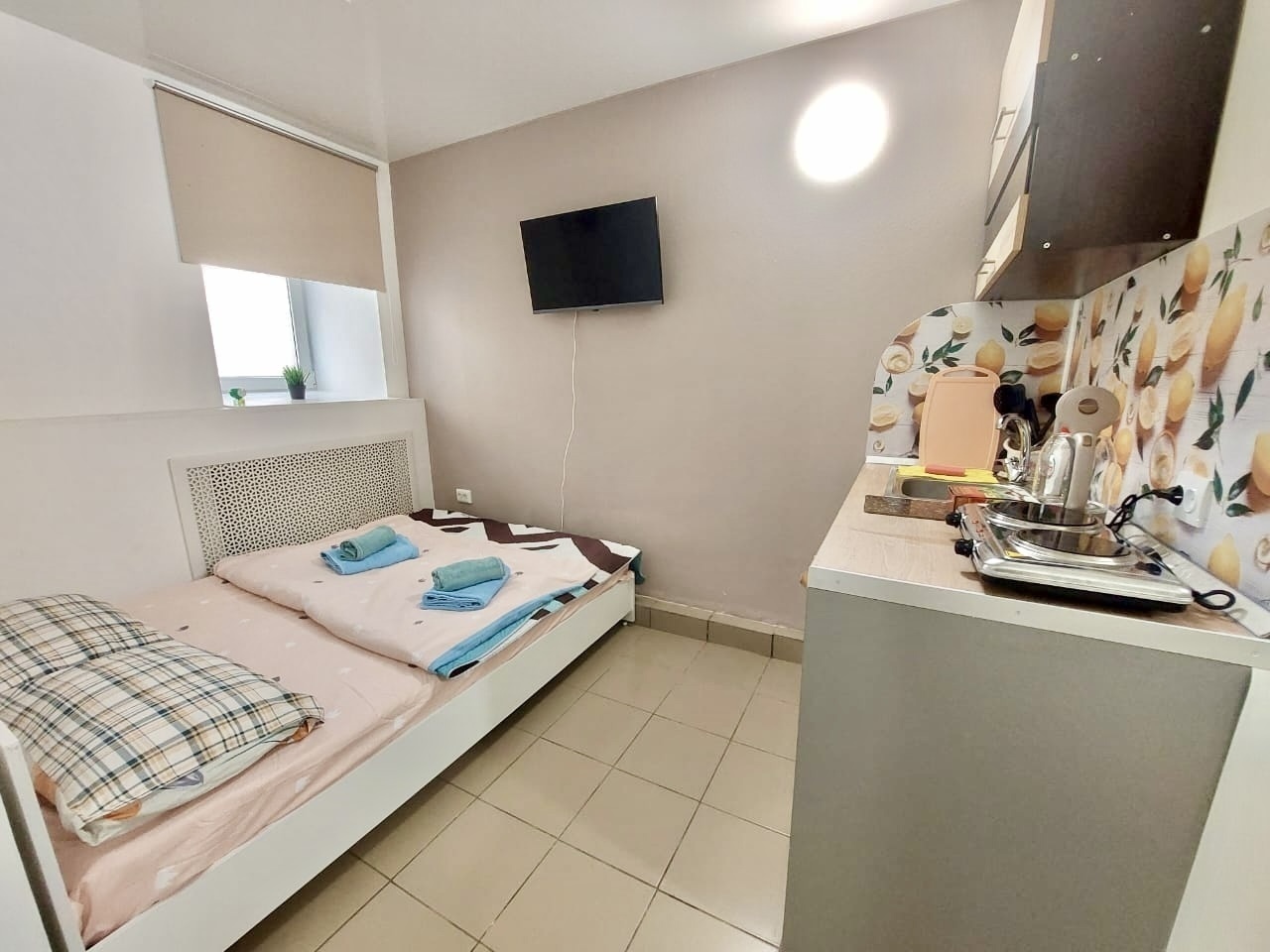 Номер с собственным санузлом и кухней. Посуда, фен, утюг, постельные принадлежности и полотенца, шампунь, гель и чай есть все для спокойного отдыха