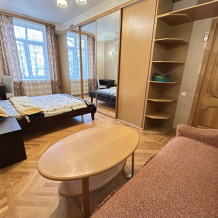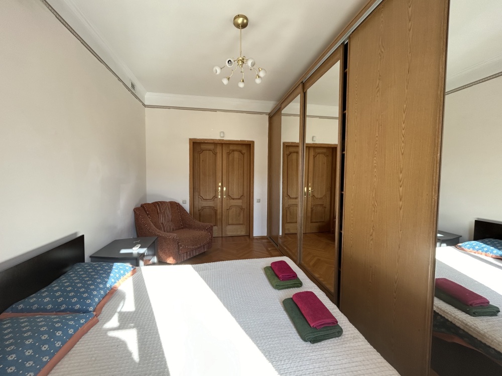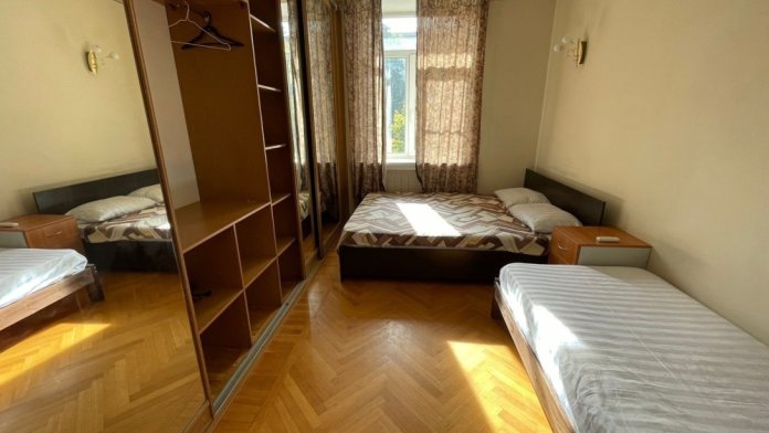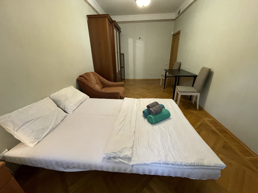 Наполнение комнат: спальные места: двуспальная кровать и односпальное кресло-кровать, постельное бельё, полотенца, зеркало, шкаф, стол и стул.