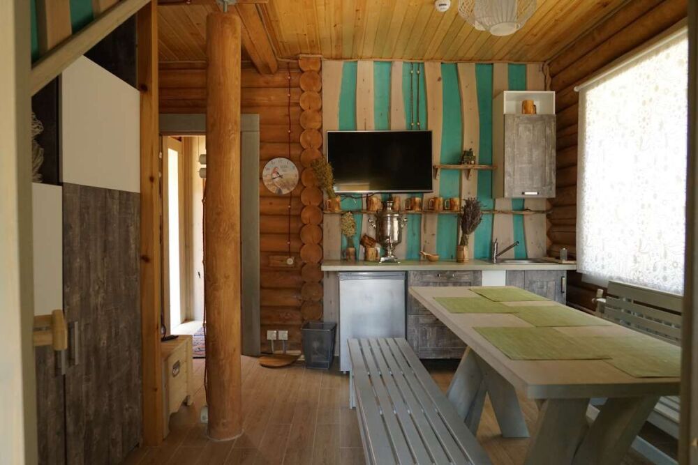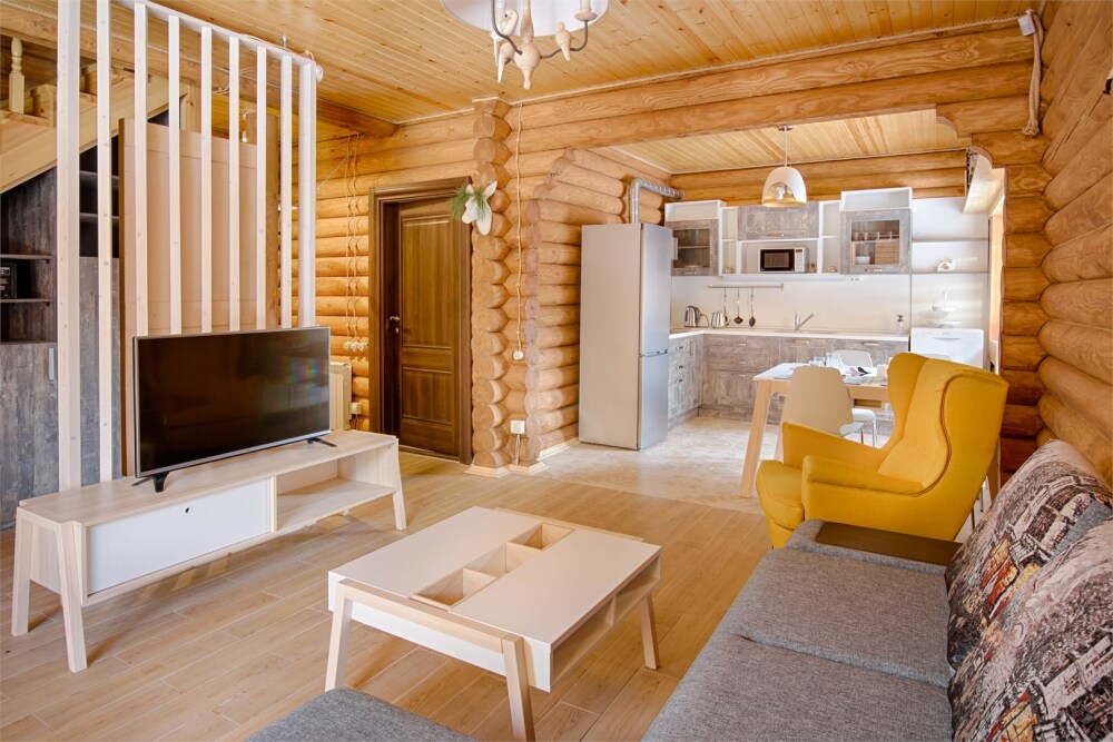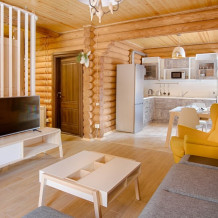 Коттедж состоит из просторной гостиной, полноценной кухни, двух спален на втором этаже коттеджа, оснащён двумя санузлами, которые укомплектованы всей современной техникой, необходимой для комфортного проживания. К услугам гостей бесплатный Wi-Fi, в каждой комнате - телевизор. По желанию гостей предоставляется ежедневная уборка коттеджа.