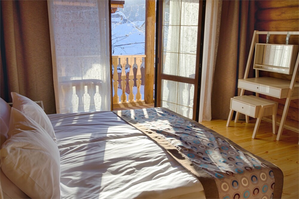 Избушки с любовью декорированы и обставлены, оснащены скоростным интернетом. Удобные одно- и двуспальные места, современная кухня, туалеты, душевые; предусмотрены места для хранения и просушки лыжного обмундирования. С балконов открывается восхитительный вид на панораму окружающих горных вершин. Каждый самый взыскательный и самый искушённый гость не останется равнодушным к уютной обстановке, которую мы совместно с талантливыми молодыми дизайнерами обустроили для наших гостей.