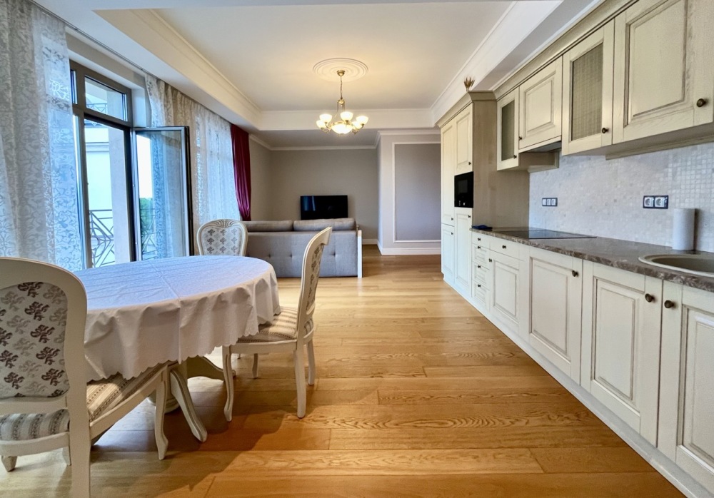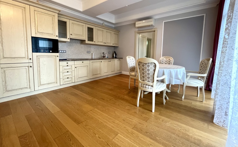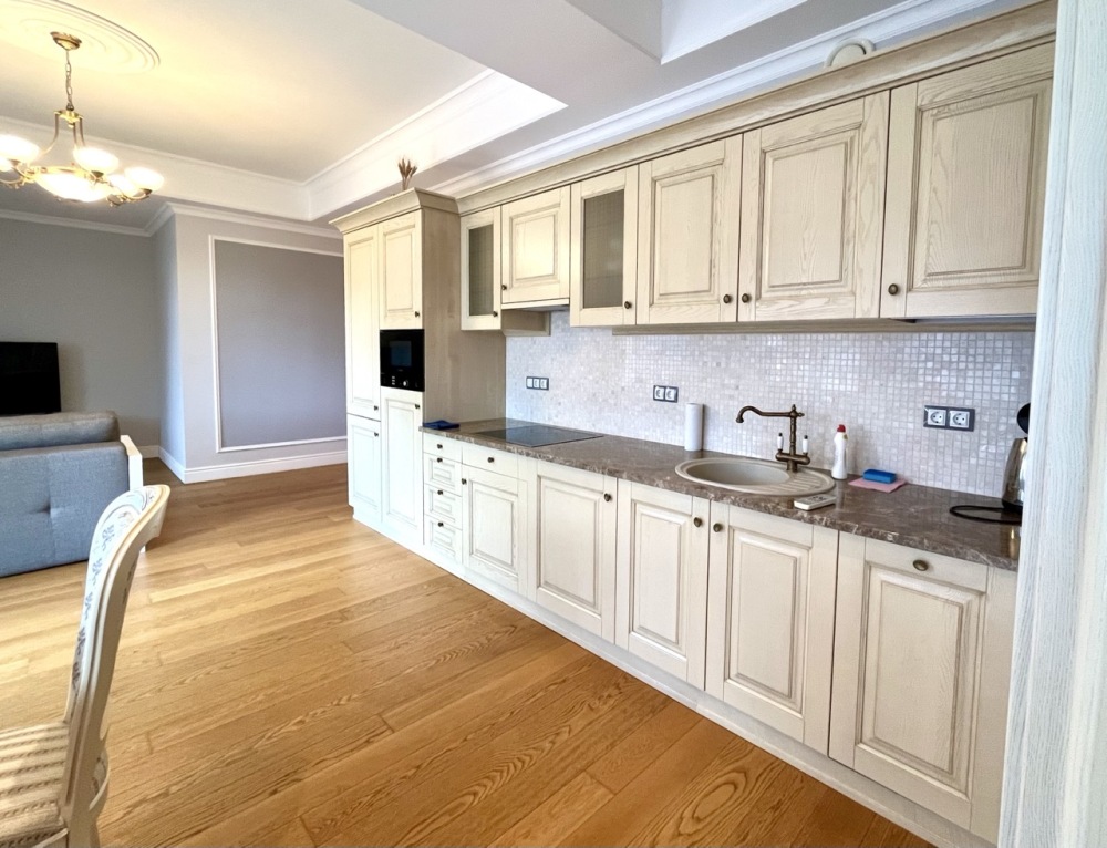 - Гостиная-кухня: просторная зона с дизайнерской мебелью, двуспальным диваном, обеденной группой и техникой (ЖК-ТВ, стиральная и посудомоечная машины, микроволновка).