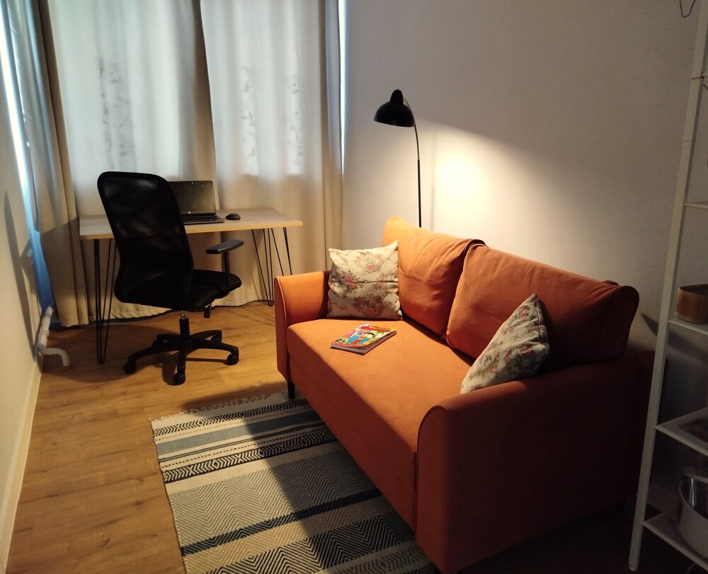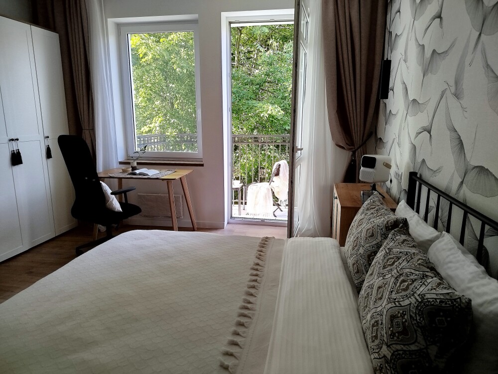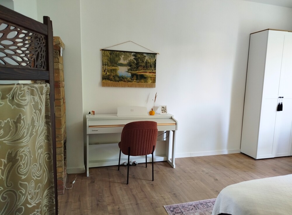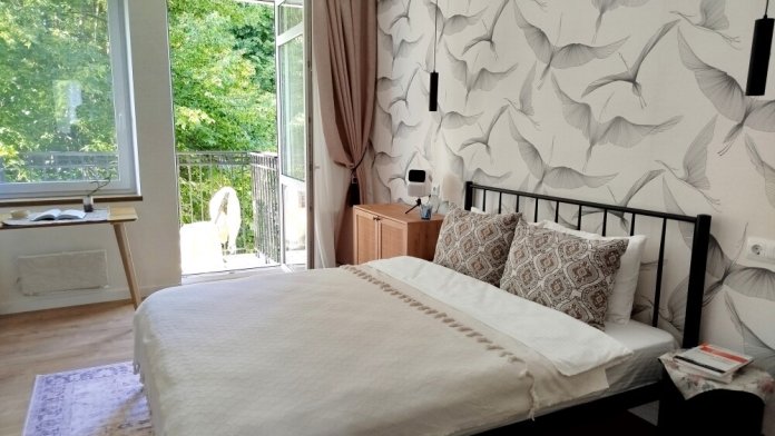 Атмосферные апартаменты «Муза» — для тех, кто ценит стиль, эстетику и необычные интерьеры. Фортепиано, кинопроектор и открытый балкон создают настроение настоящего творческого отдыха