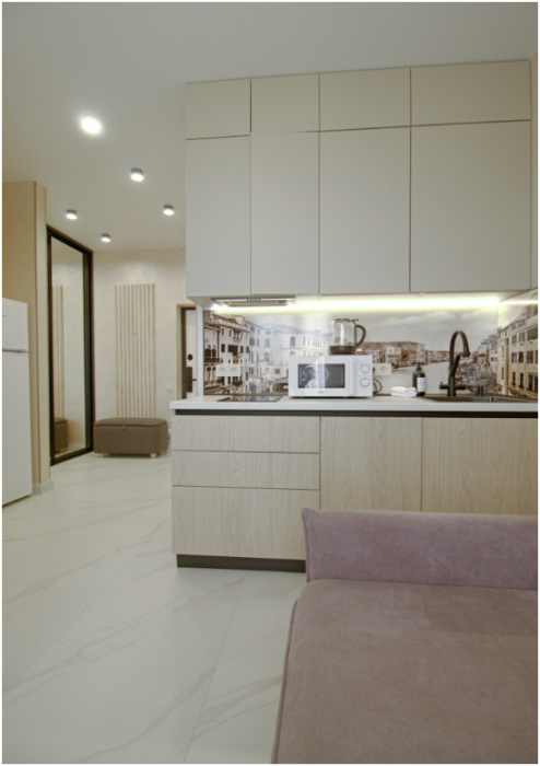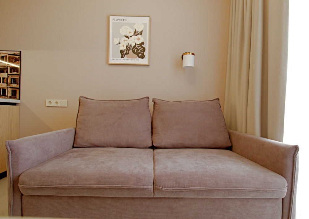 Простор: 38 м² изысканно обставленного пространства, включая изолированную спальню и уютную кухню-гостиную.