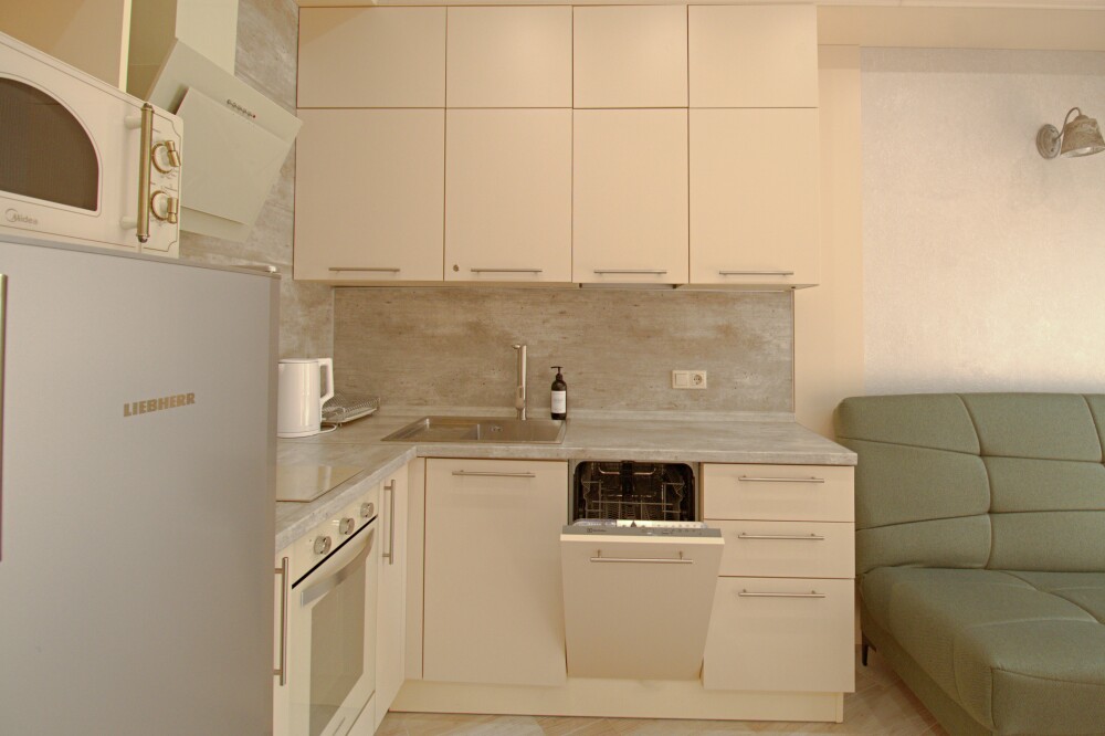 Полностью оборудованная кухня с новейшей бытовой техникой, включая посудомоечную машину и микроволновку, духовку, плюс телевизор для Вашего досуга.