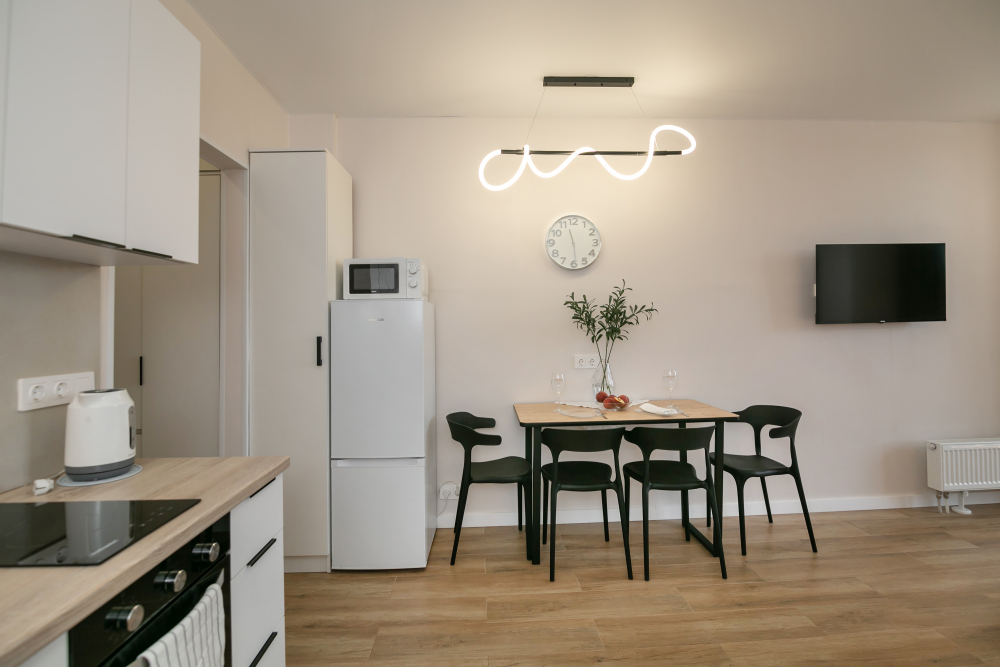 - микроволновая печь, духовой шкаф, полный комплект посуды для комфортного быта;