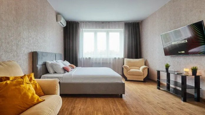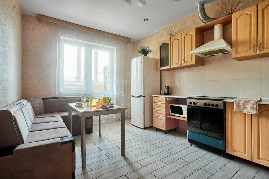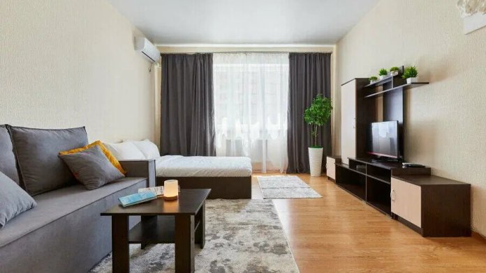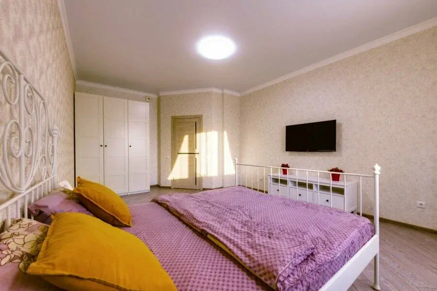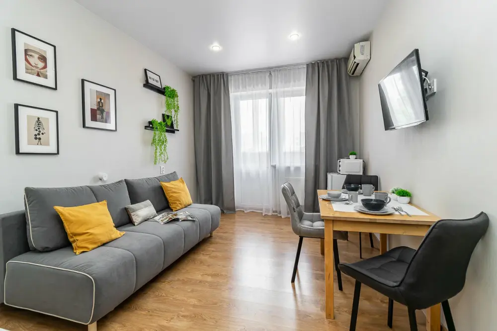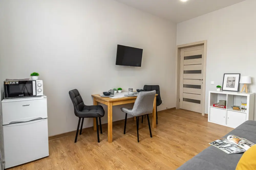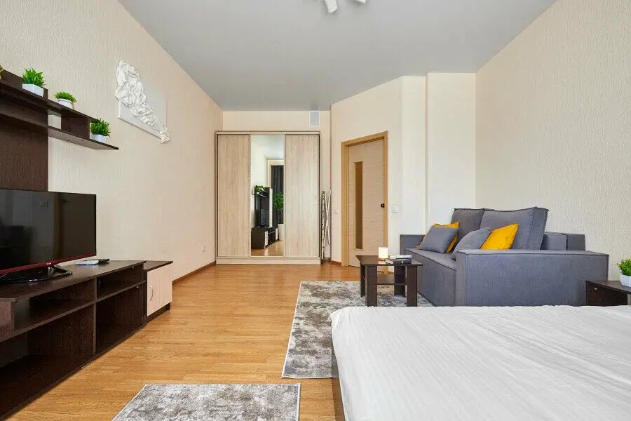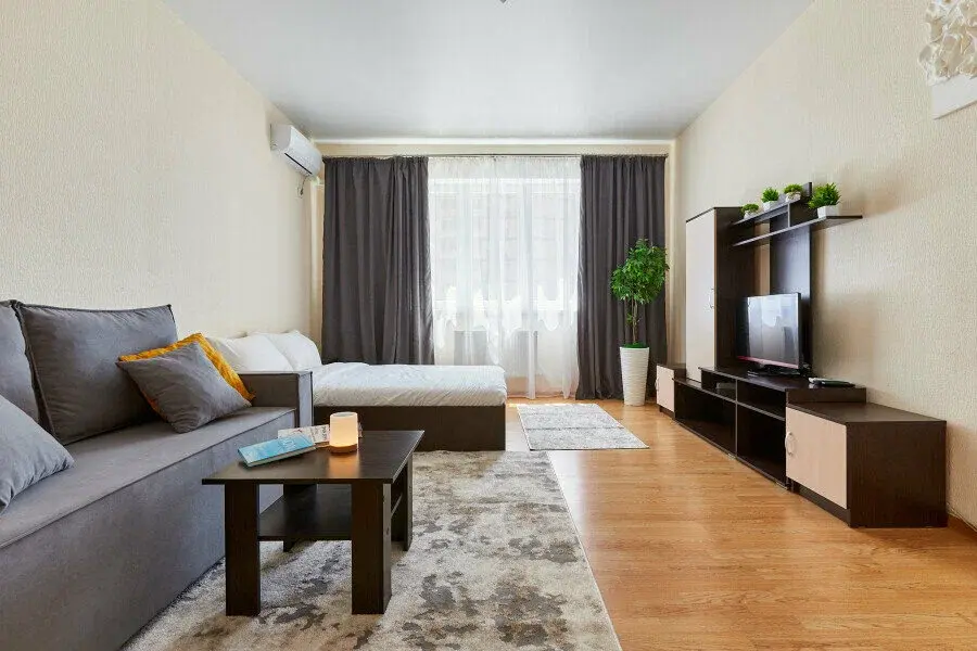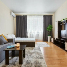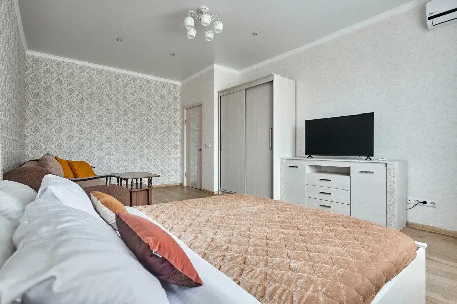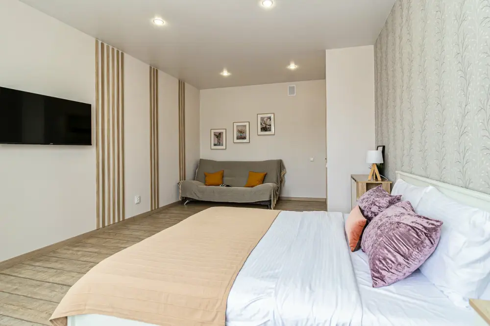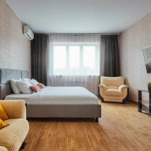 В апартаментах есть всё, чтобы вам было уютно и комфортно как дома. В квартирах выполнен европейский ремонт и создан стильный интерьер. Панорамные окна открывают чудесный вид на центр города. Современная кухня оборудована всей необходимой бытовой техникой (холодильник, посудомоечная машина, микроволновая печь, индукционная плита с сенсорным управлением, чайник), в ней также имеются посуда и столовые приборы. В комнате стоит большая удобная кровать с ортопедическим матрасом , на кухне раскладывающийся двухспальный диван.
