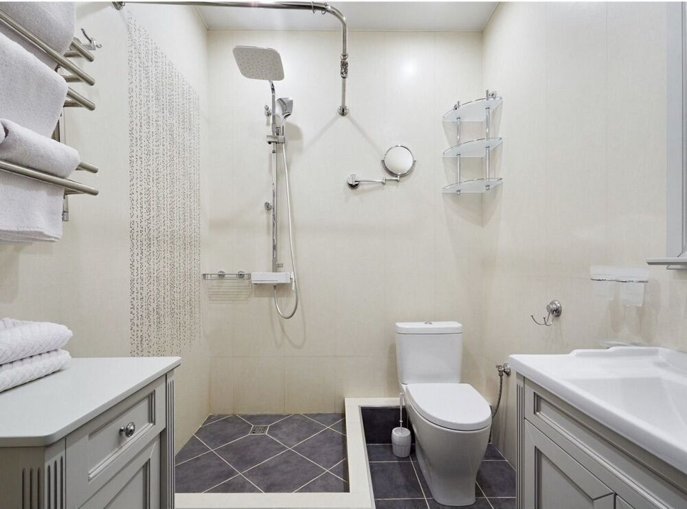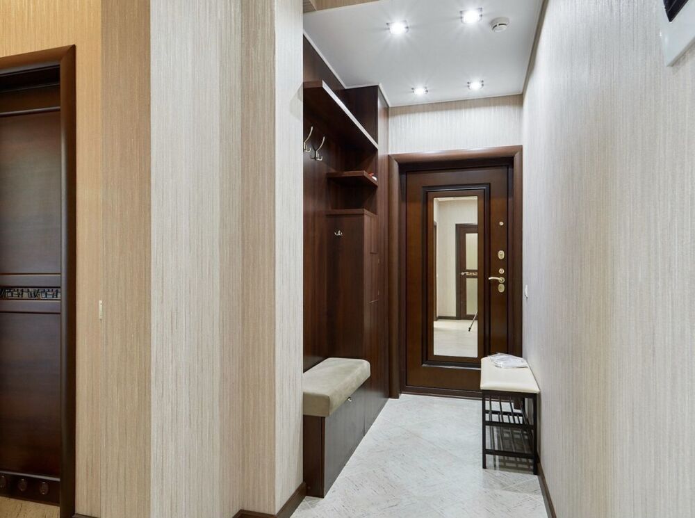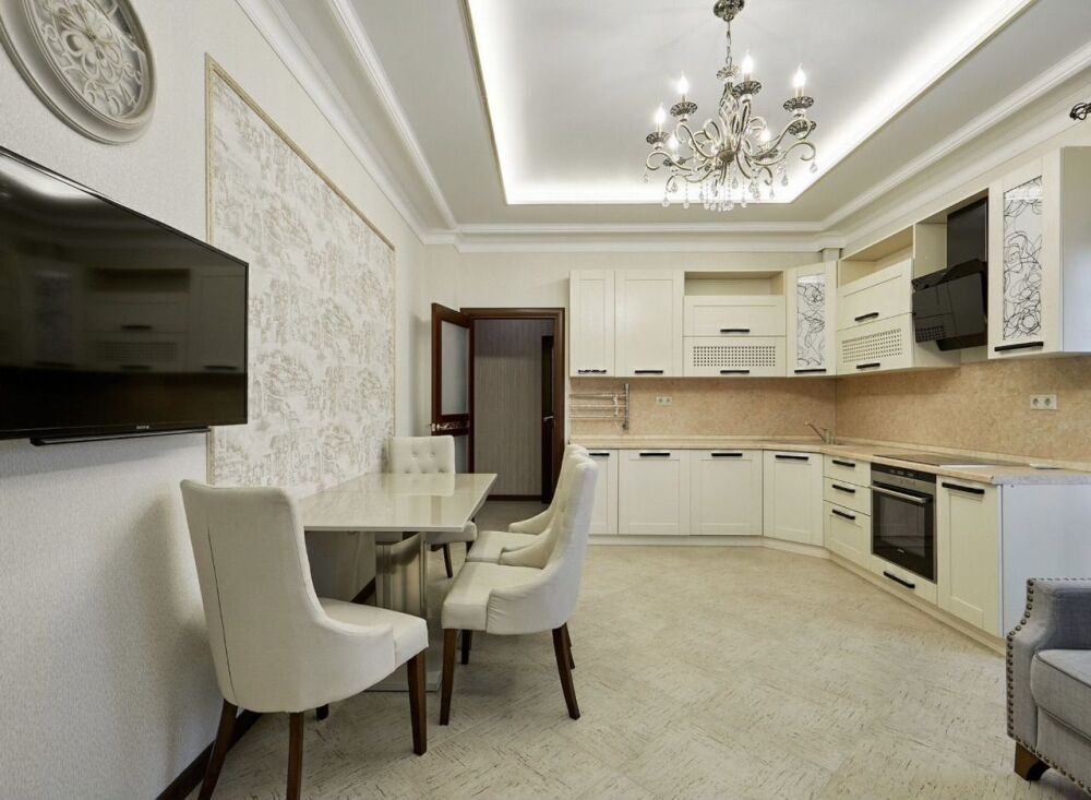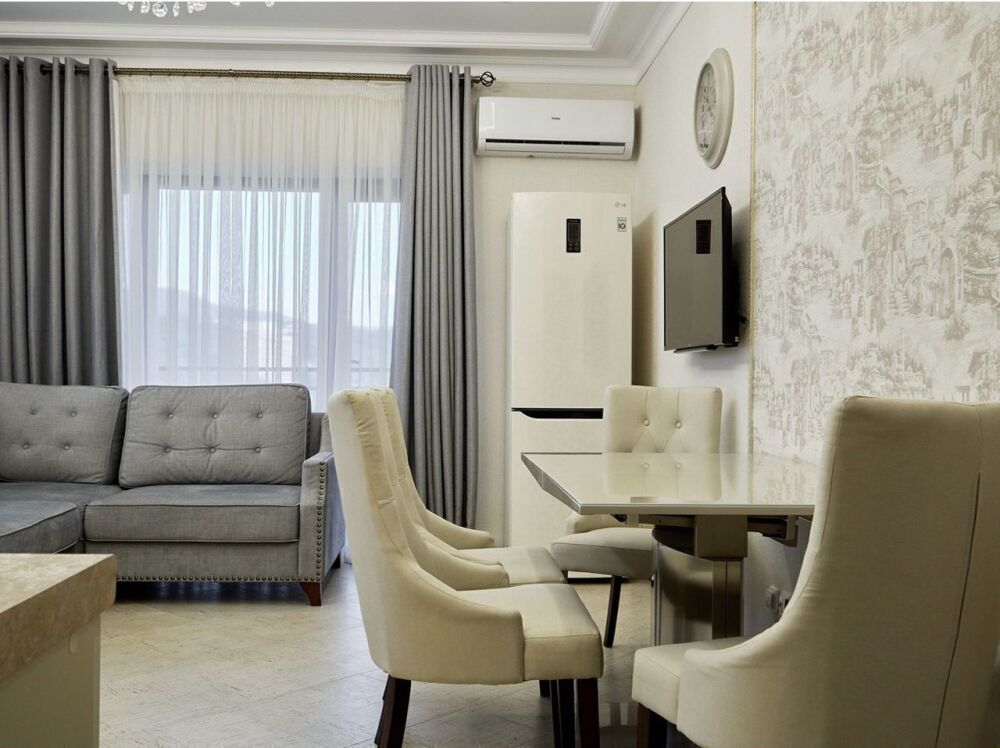 Интерьер выполнен в светлых оттенках, что создает ощущение простора и свободы. Каждая деталь продумана до мелочей: удобная мягкая мебель, дизайнерская отделка стен и потолков, качественная бытовая техника. Квартира оборудована всей необходимой техникой для комфортного проживания, включая кондиционер, Wi-Fi, телевизор с большим экраном и современную кухню.