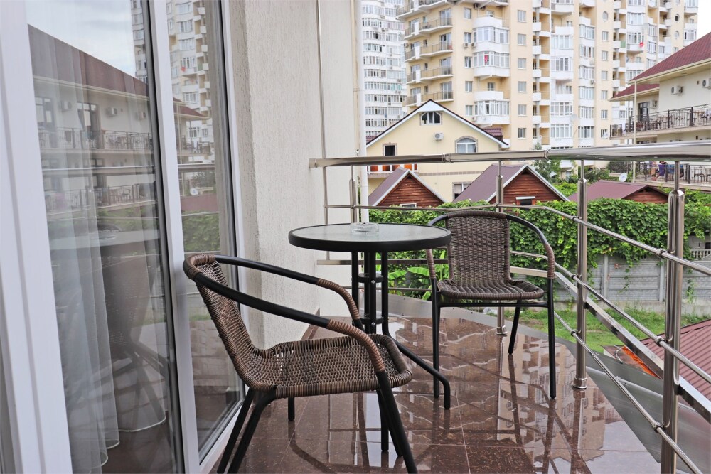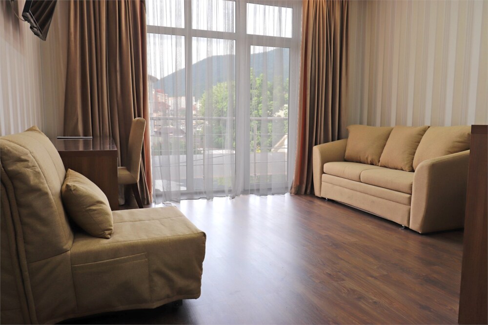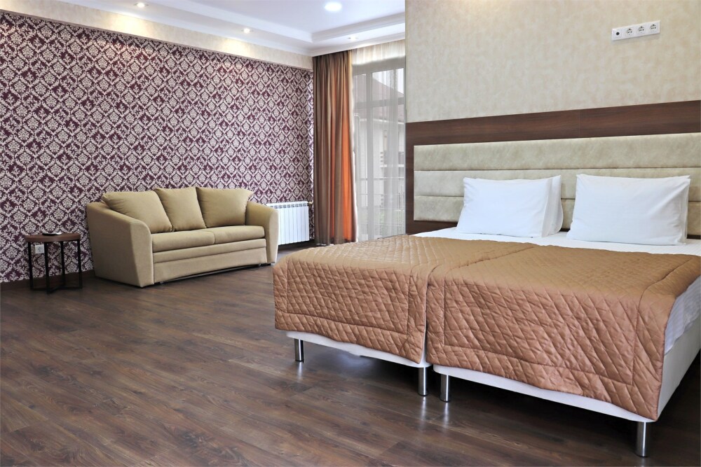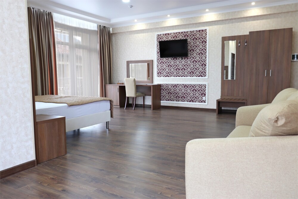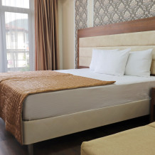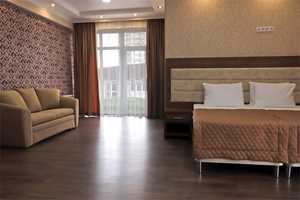 Звукоизолированный большой номер с одной большой кроватью, диван-кроватью и кресло-кроватью и двумя балконами. Один ребёнок до 3 лет — можно без отдельного спального места.