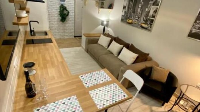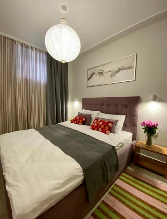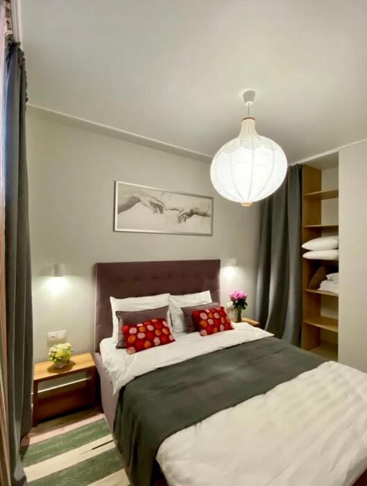 Спальня с двуспальной кроватью 160*200 и гардеробной. Гостиная с кухонной зоной и кофейным уголком. Диван двуспальный со спальным местом 180*200. Полностью укомплектована новым постельным бельём и полотенцами.