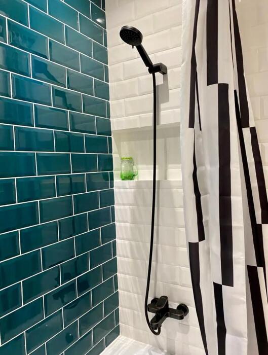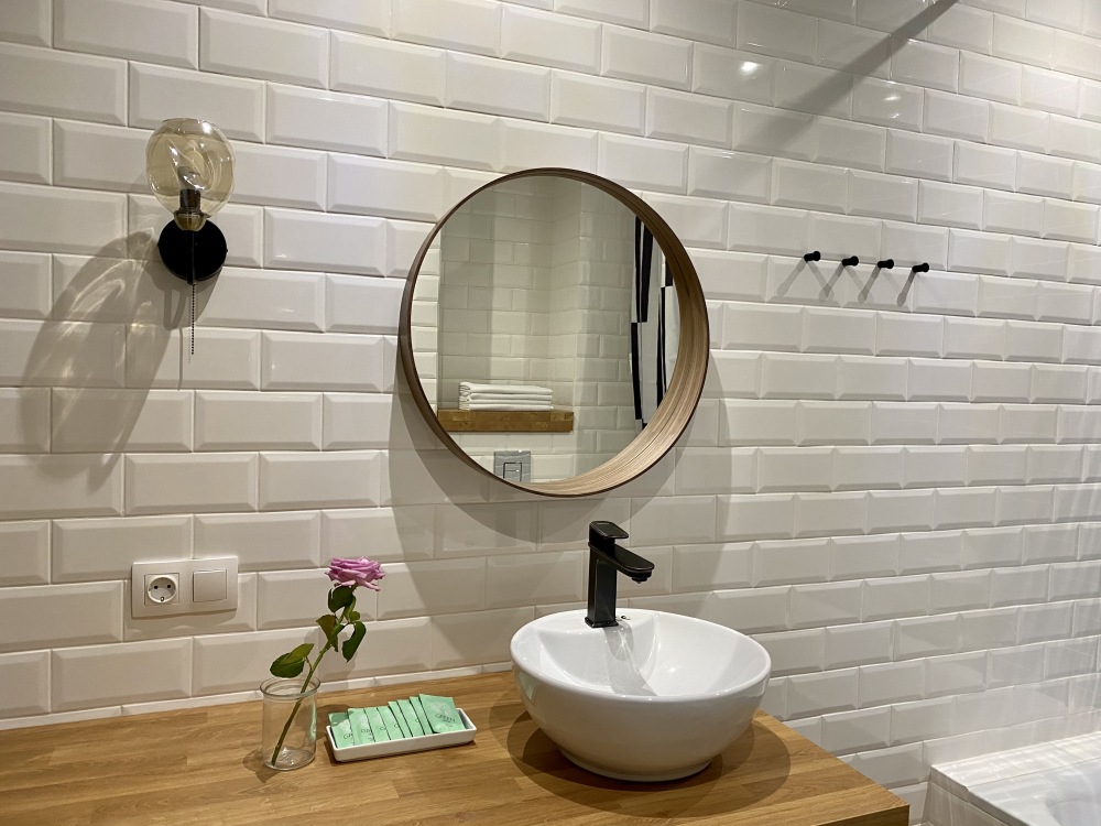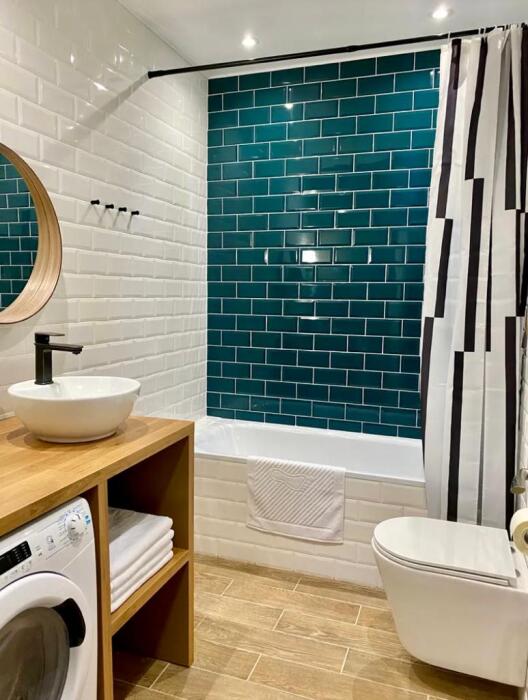 В санузле: стирально-сушильная машина, фен, косметические средства, ванна.