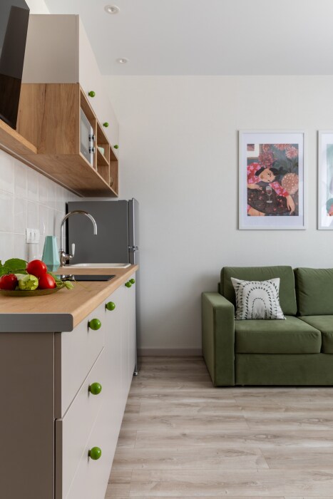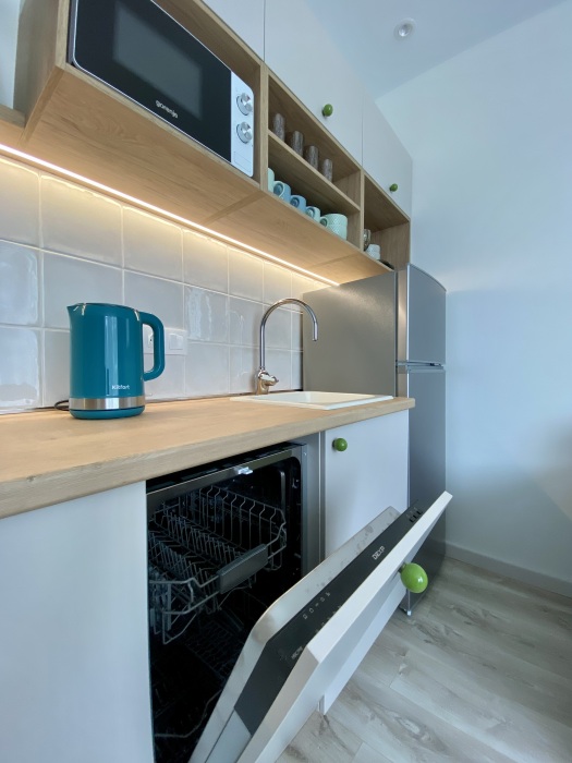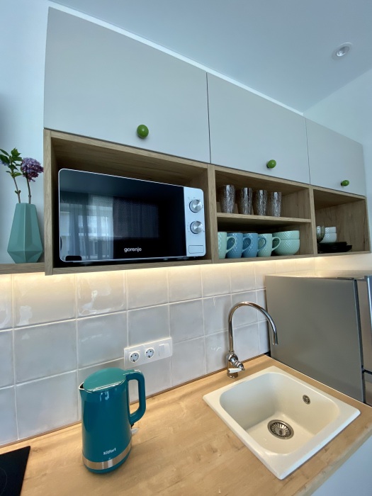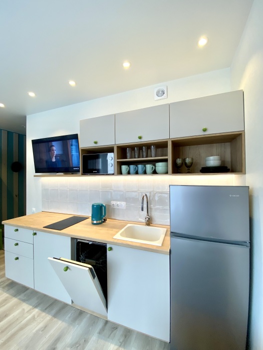 Оснащена всем необходимым для качественного отдыха посуточно в любое время года. Подходит для проживания как семьи до 4 человек, так и для одиночных путешественников. Полностью укомплектована мебелью, техникой, красивой посудой, хорошим белоснежным постельным бельём и полотенцами.