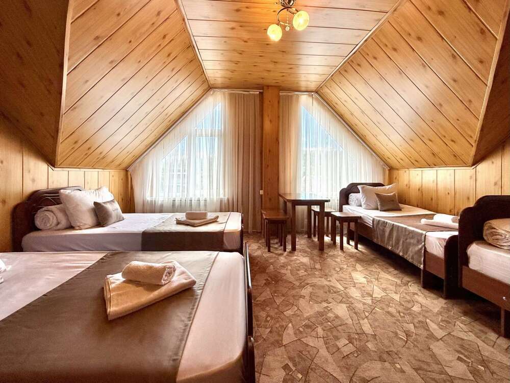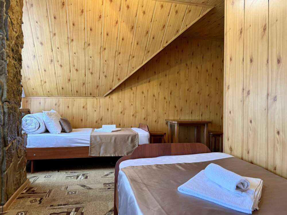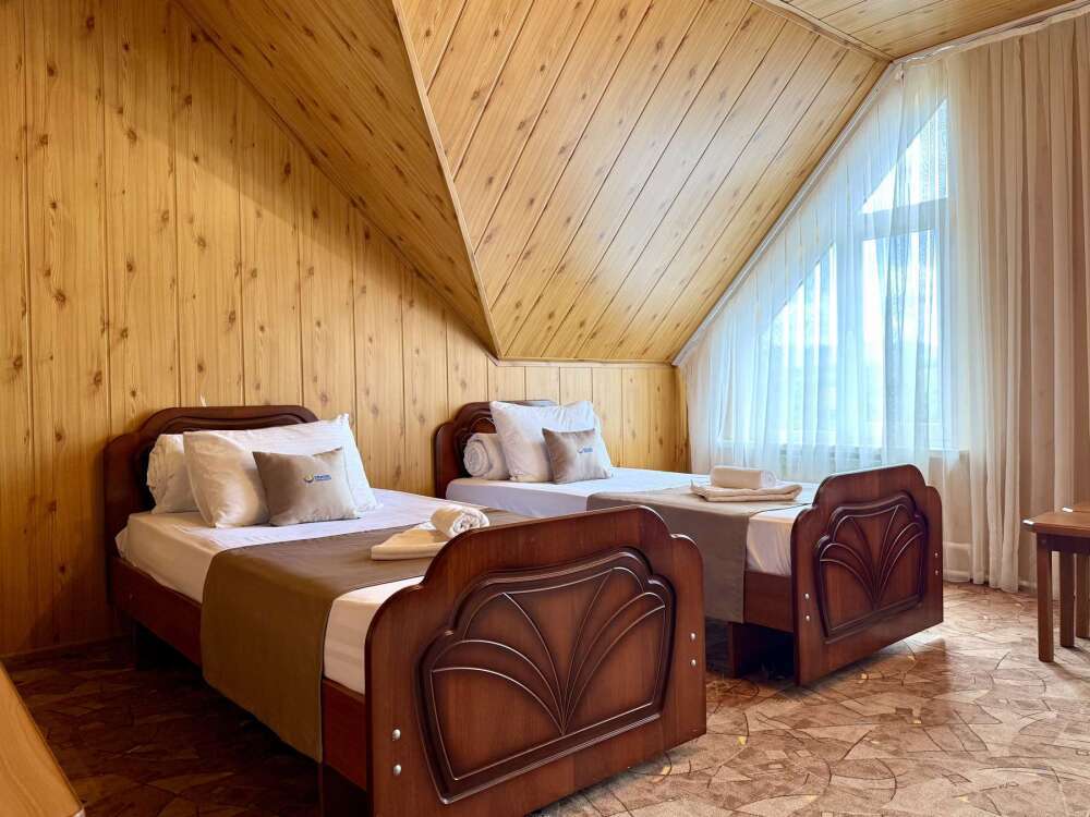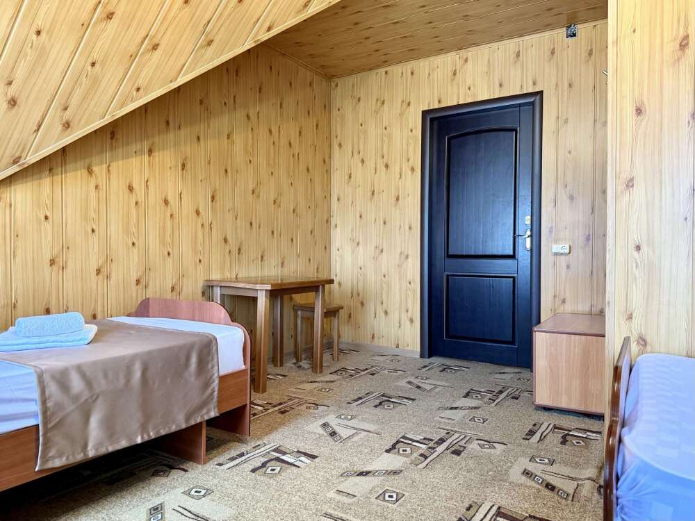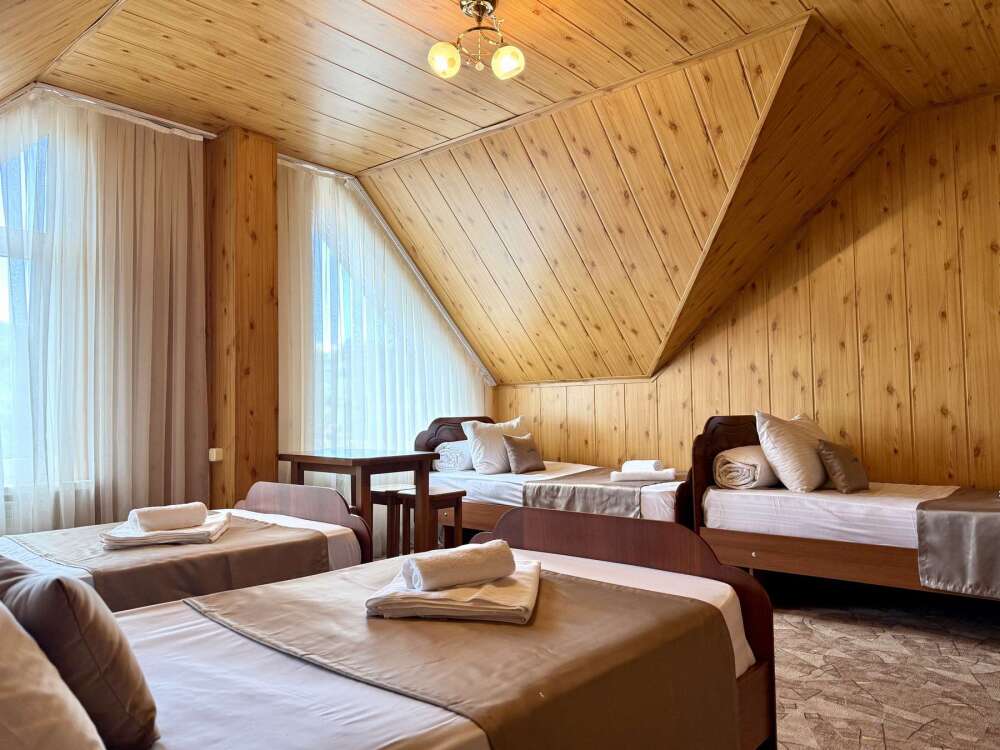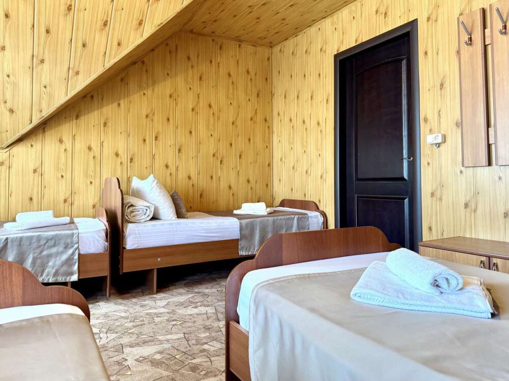 Уютный номер с доступом к общему балкону — для ценителей простоты и уюта. Номер с четырьмя односпальными кроватями, где после активного дня на природе вы окунётесь в тишину и отдых.