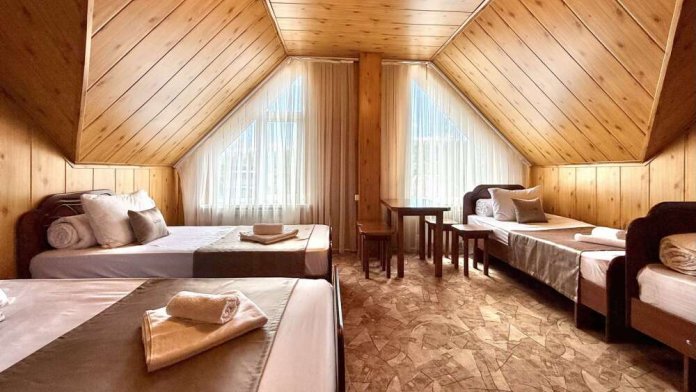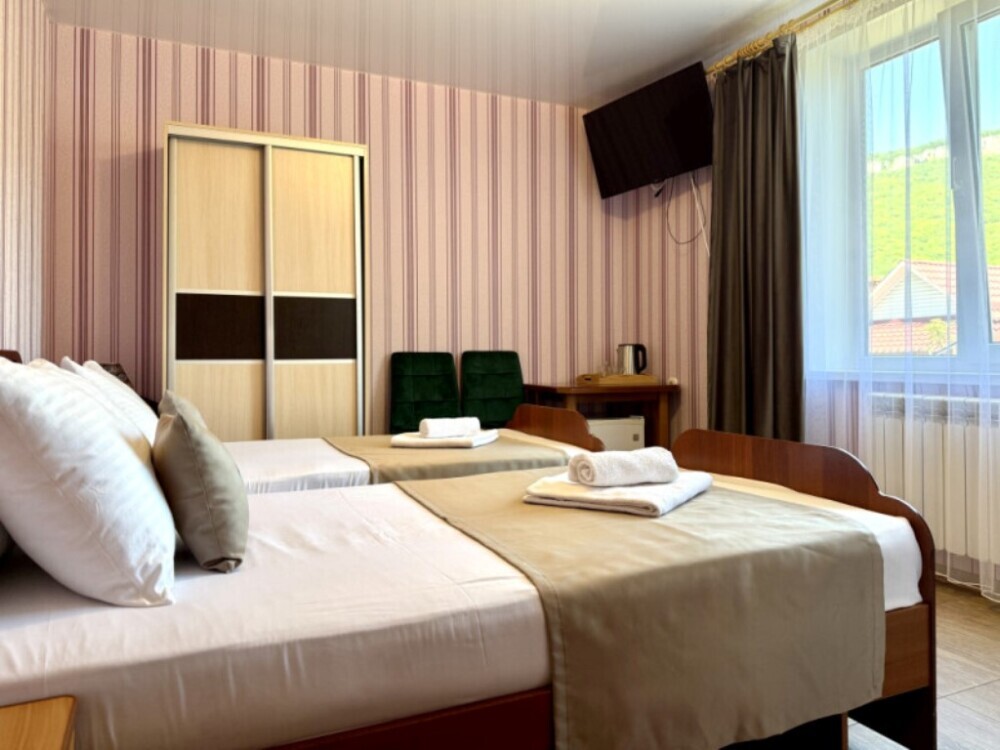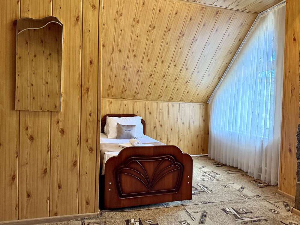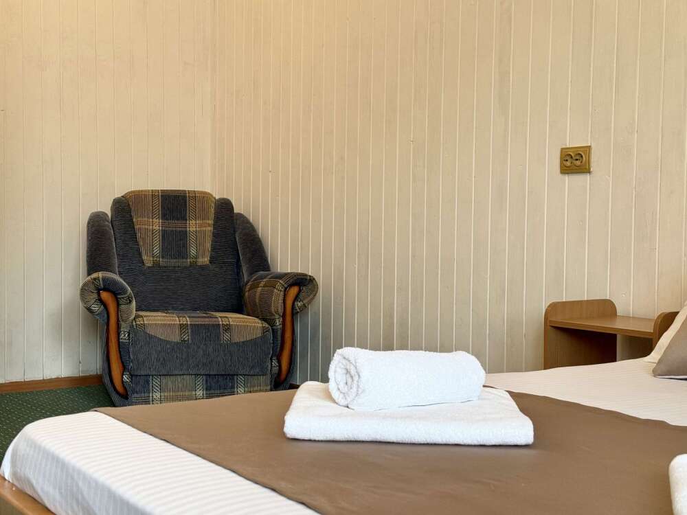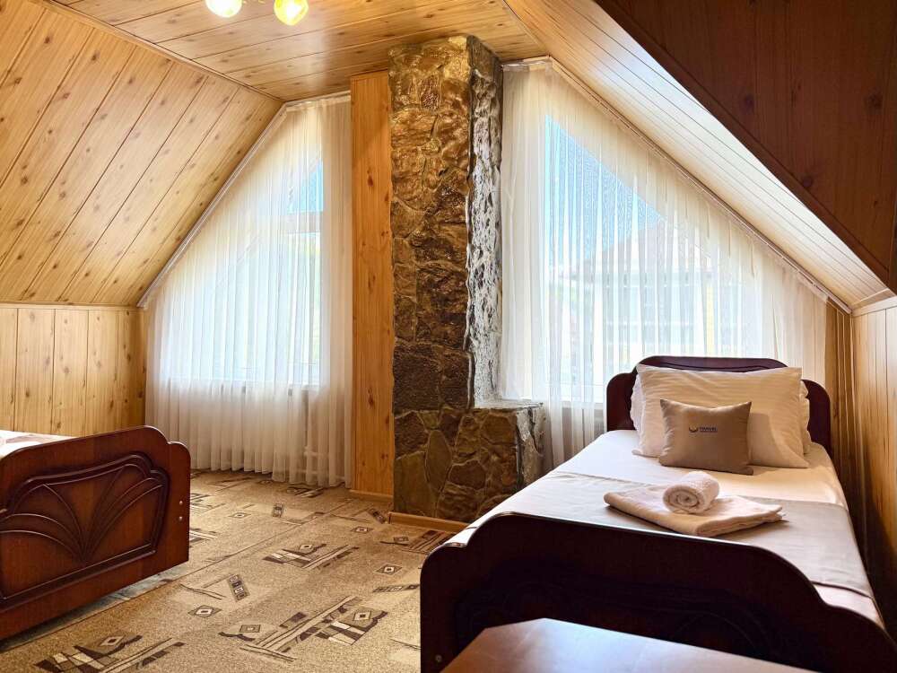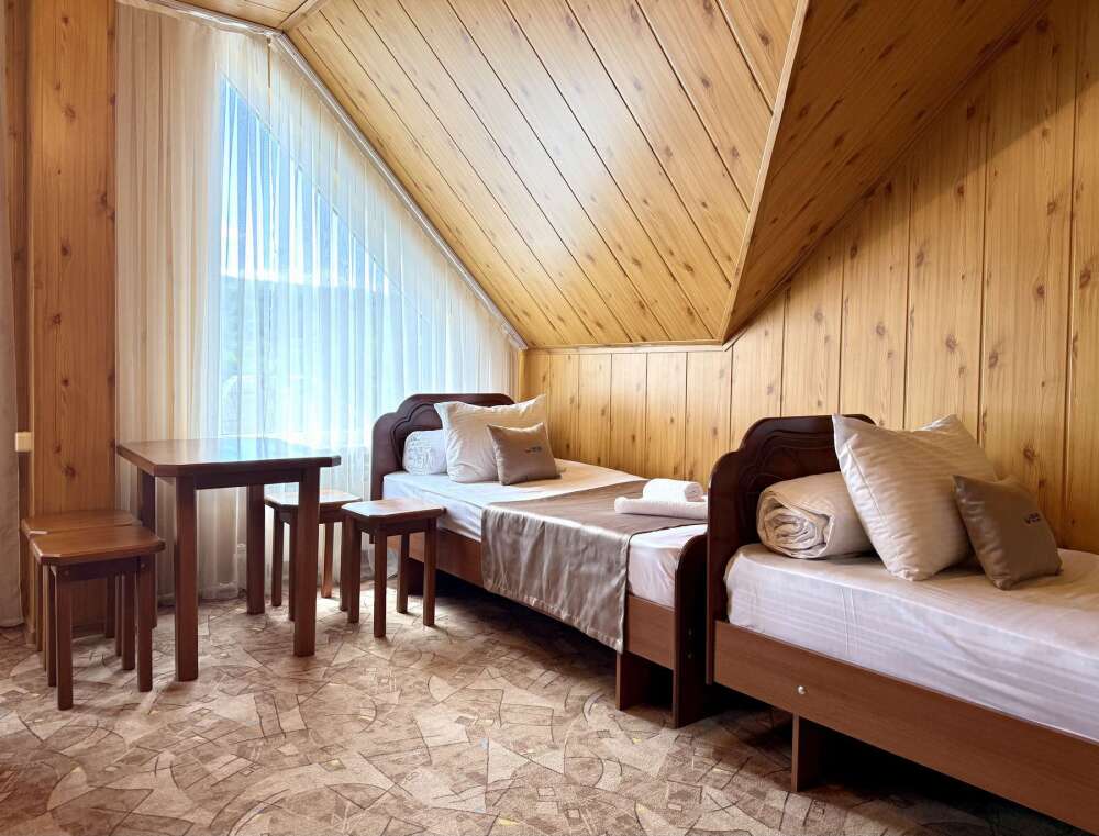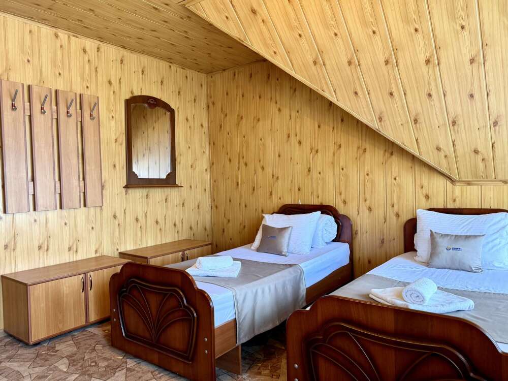Уютный номер с доступом к общему балкону — для ценителей простоты и уюта. Номер с четырьмя односпальными кроватями, где после активного дня на природе вы окунётесь в тишину и отдых.