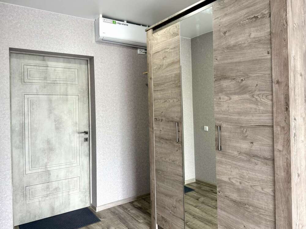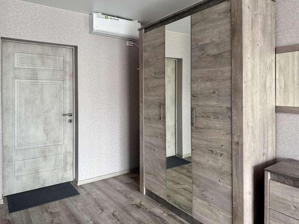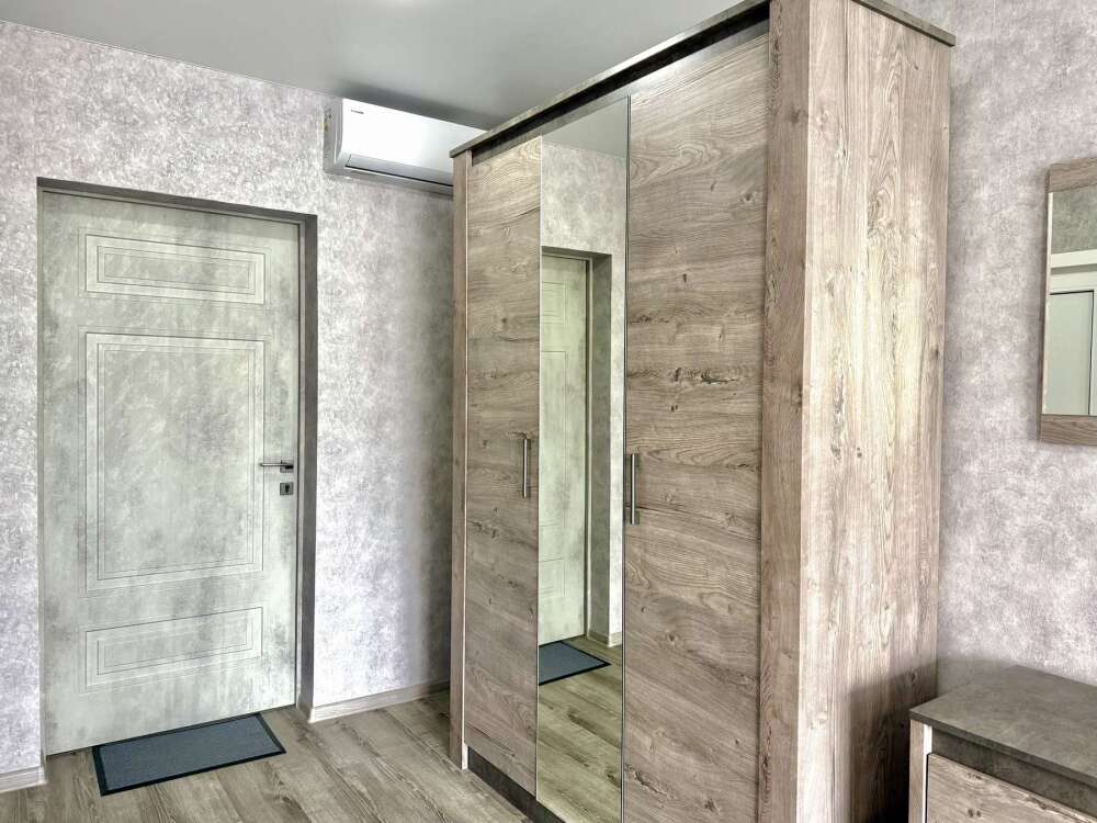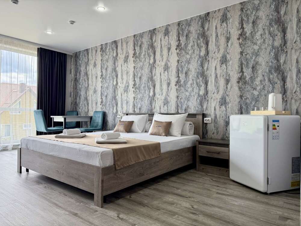 — Просторная двуспальная кровать и односпальная кровать — Собственная ванная комната с душем, феном и бесплатными косметическими принадлежностями — Телевизор, холодильник, сплит-система, чайник, стол, стулья, прикроватные тумбочки, шкаф — Ламинат, современный интерьер, панорамные окна в пол