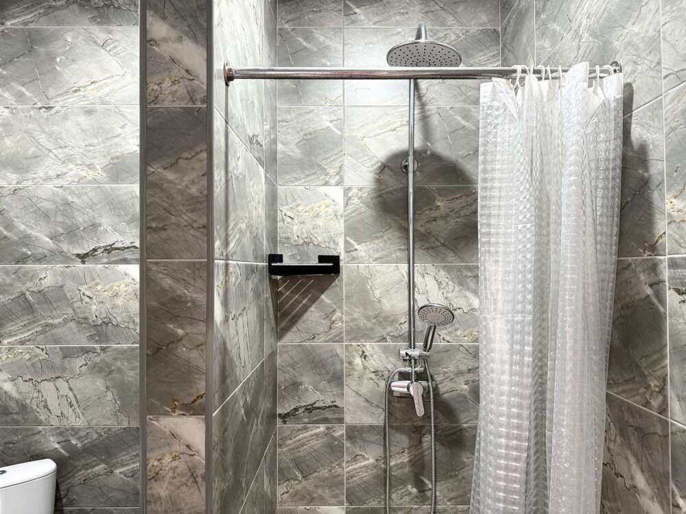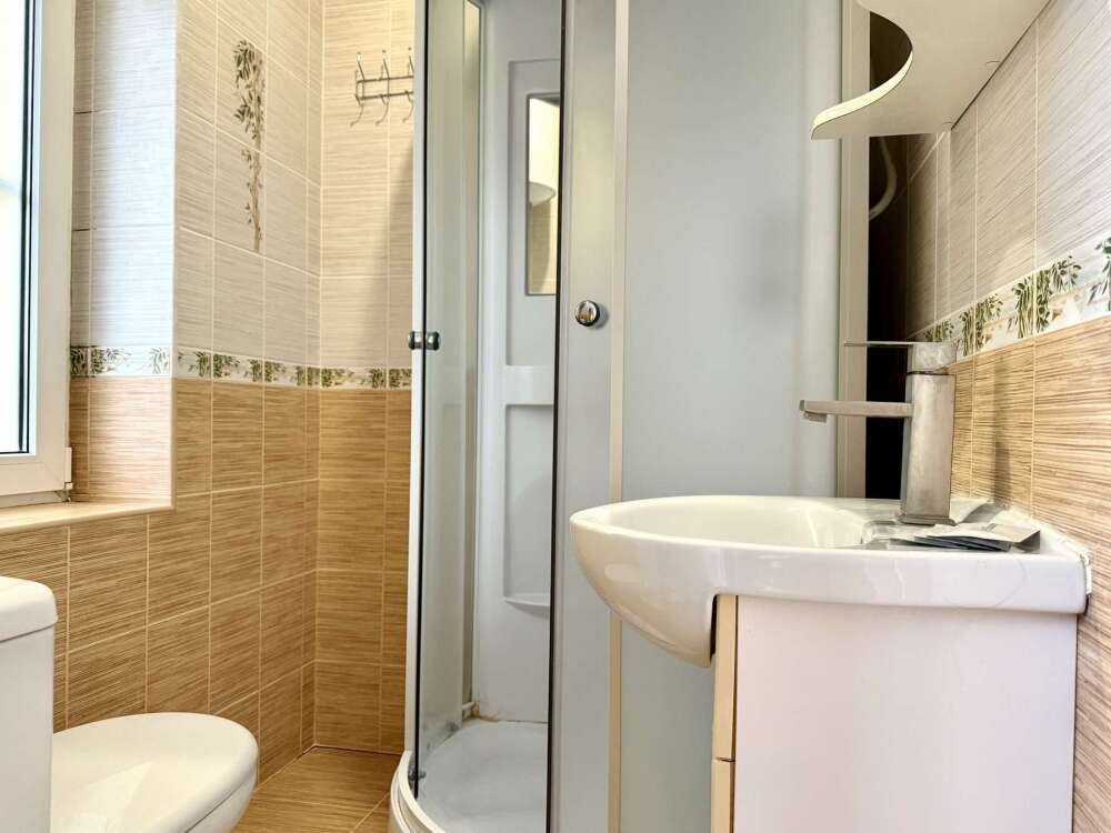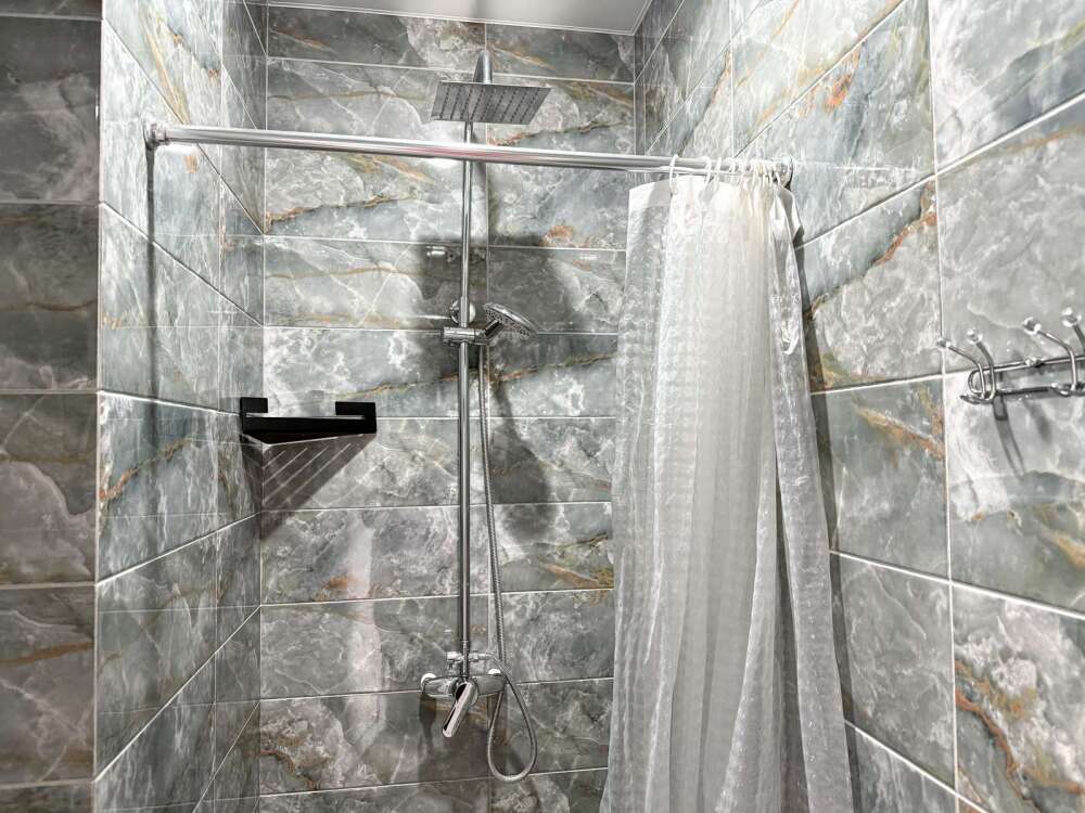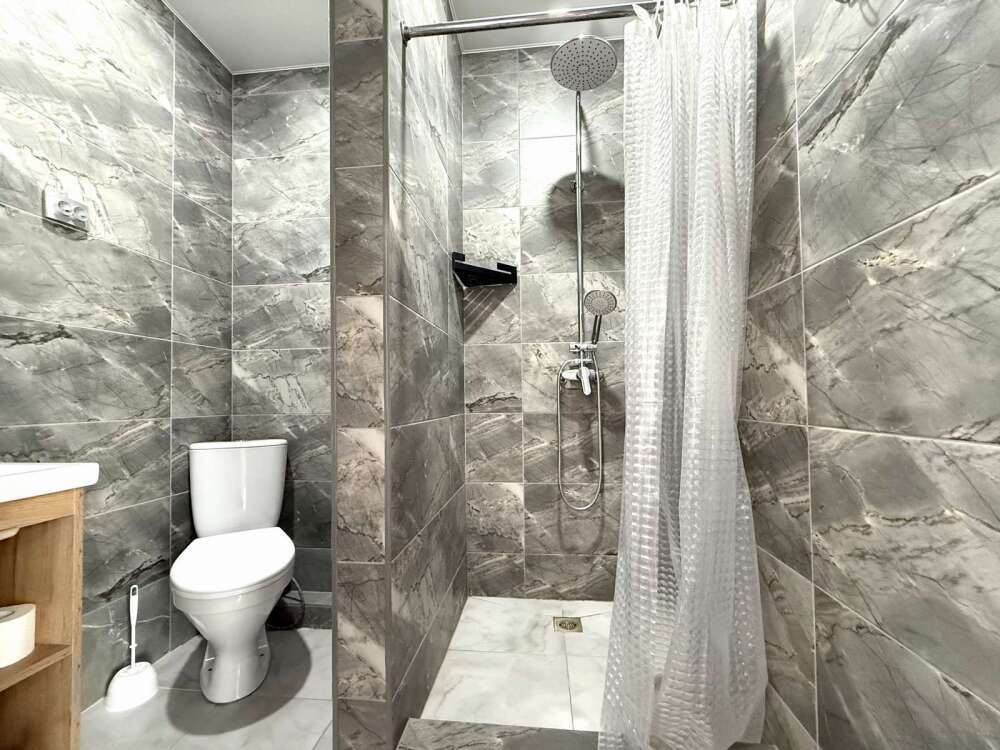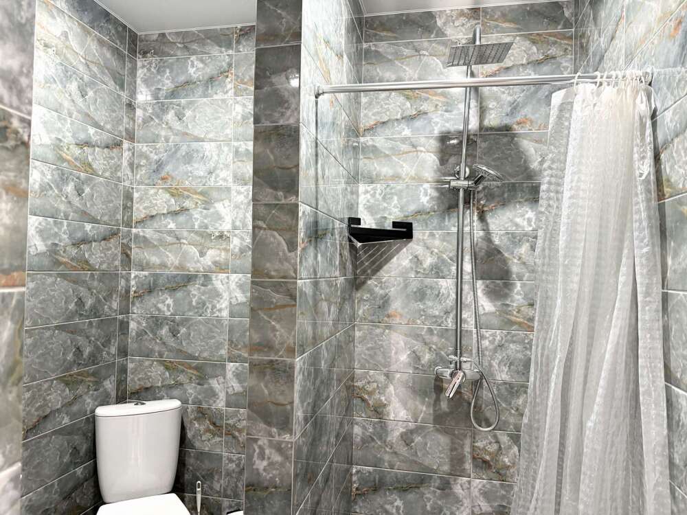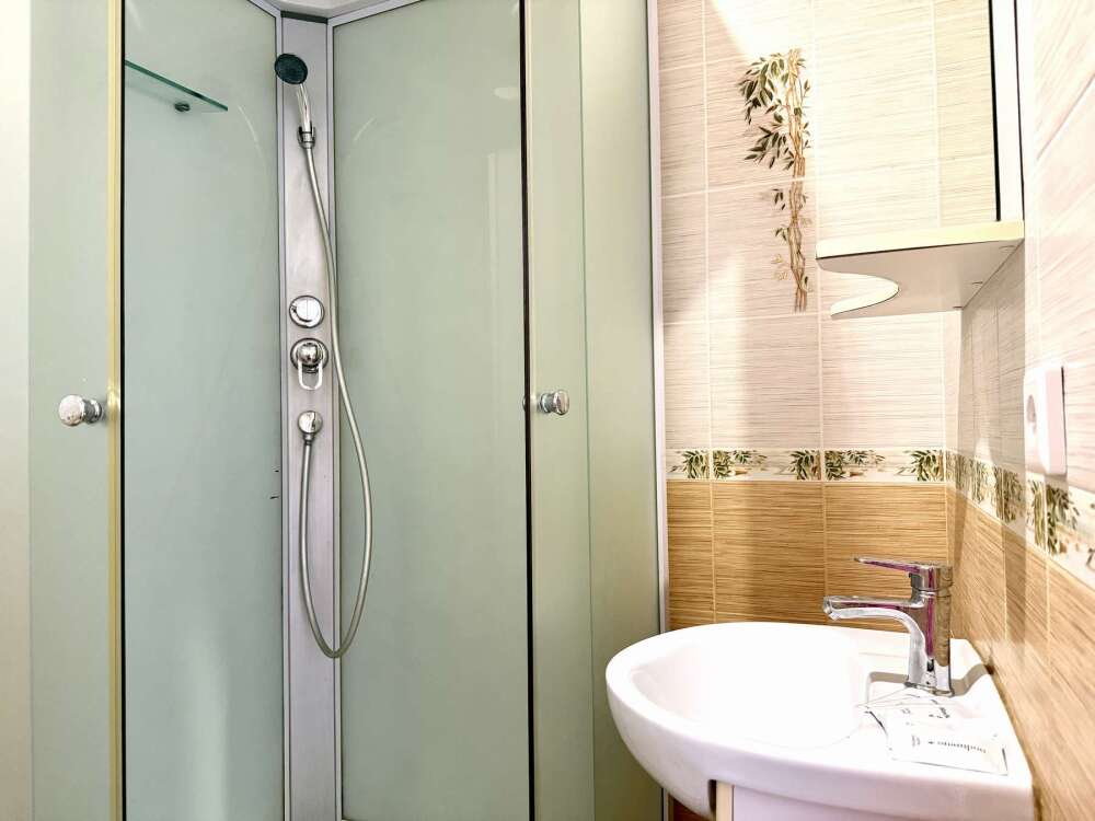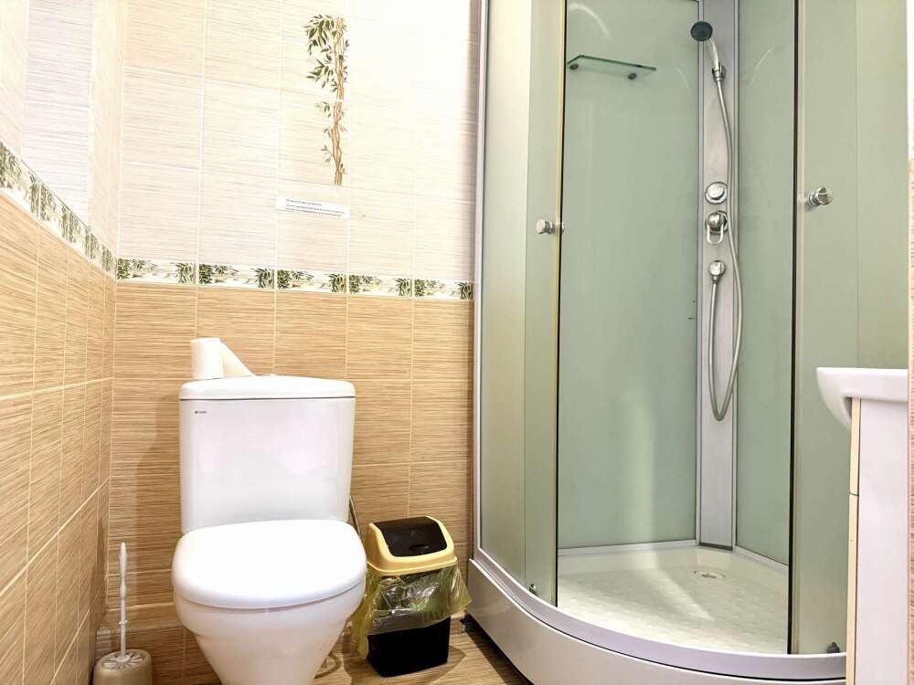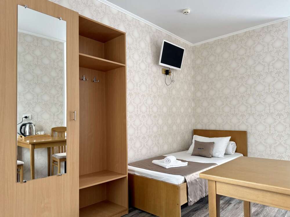 — Двуспальная кровать — Собственная ванная комната с душевой кабинкой и тёплым полом, бесплатные косметические принадлежности — Телевизор, холодильник, чайник, стол, стулья, шкаф — Ковролин или плитка, нейтральный интерьер.