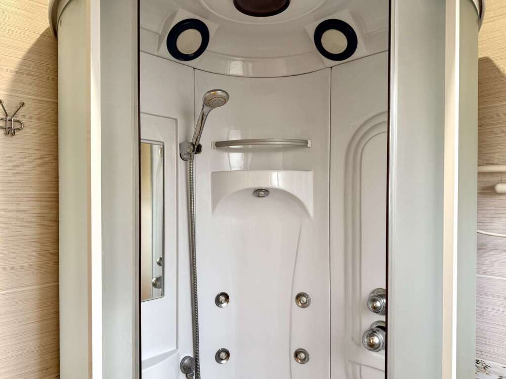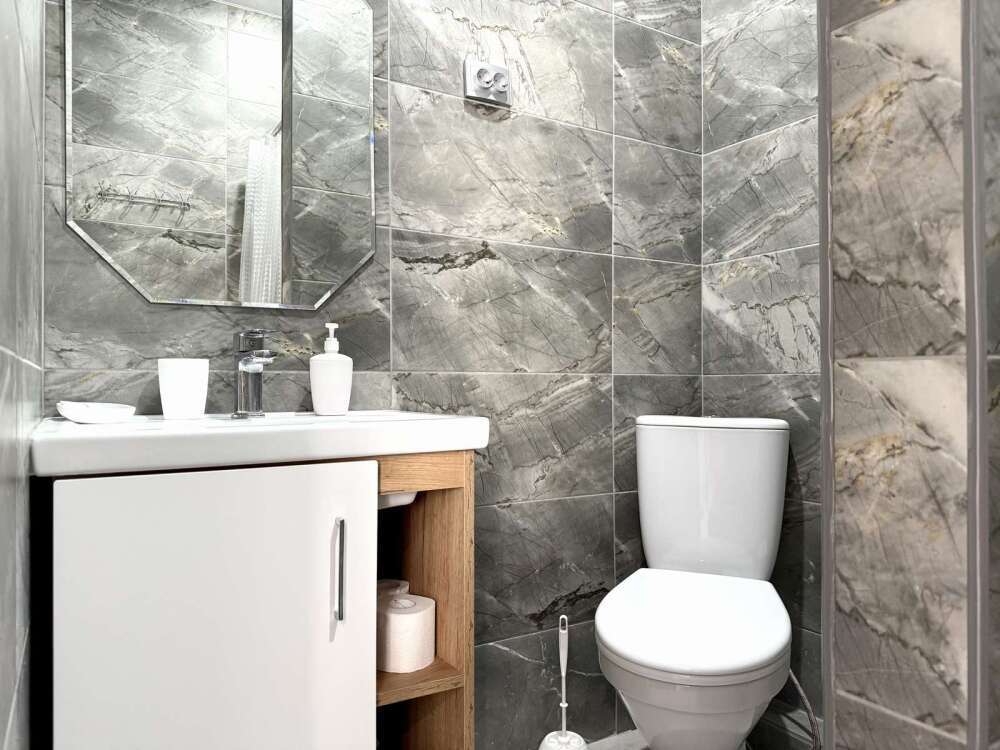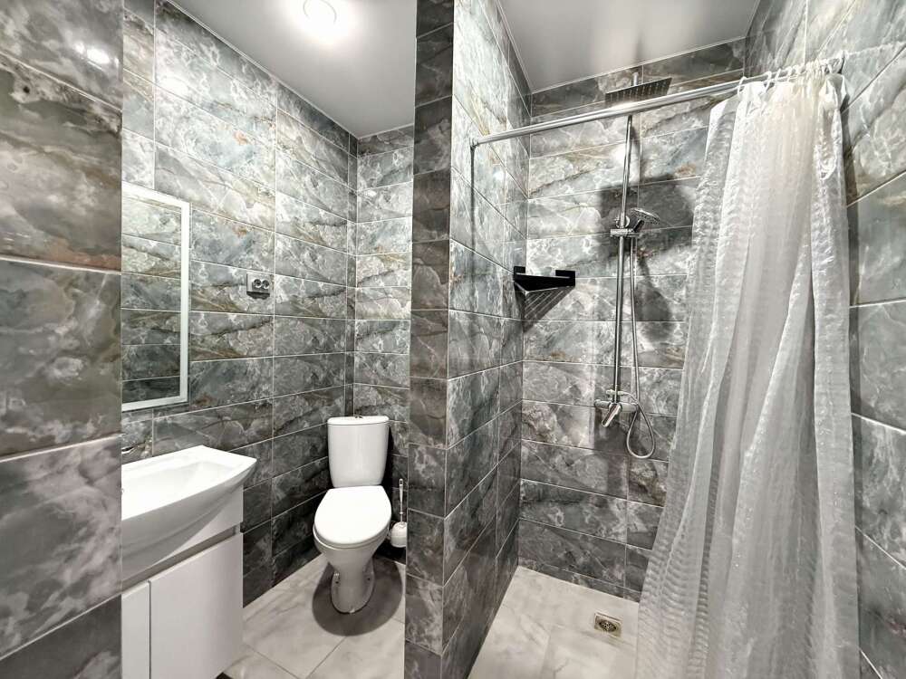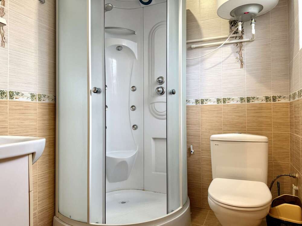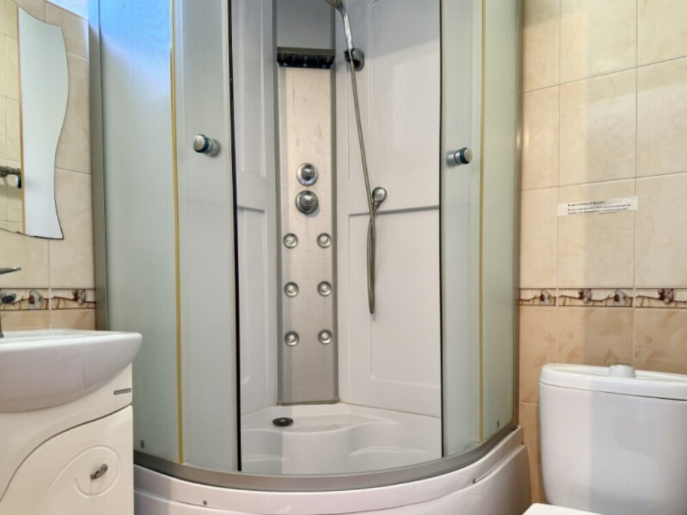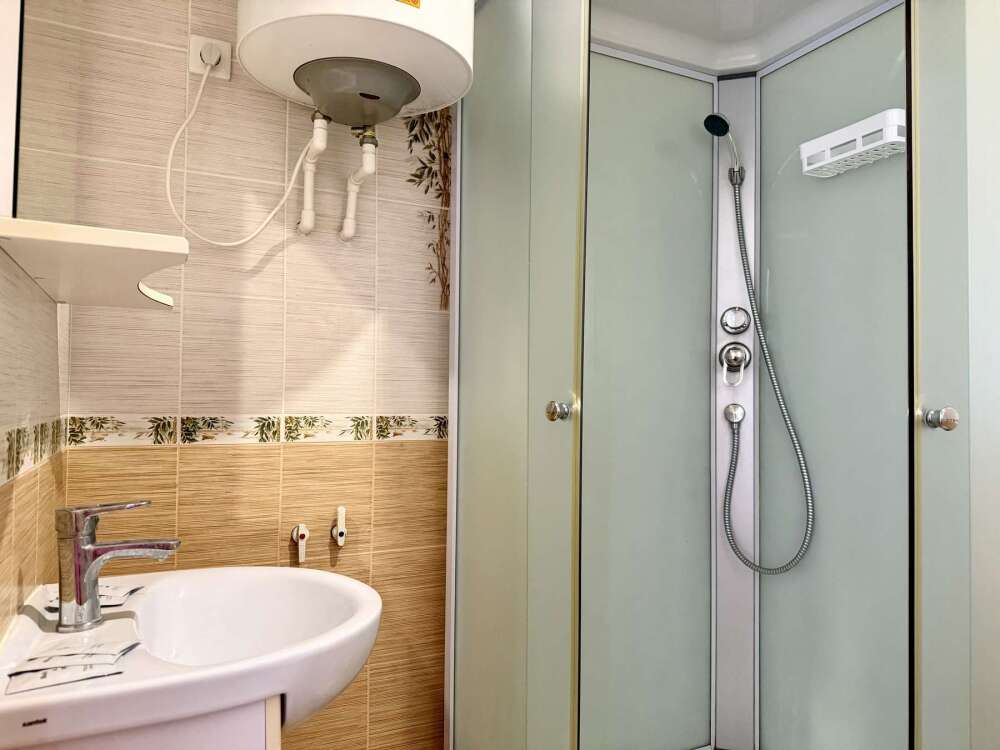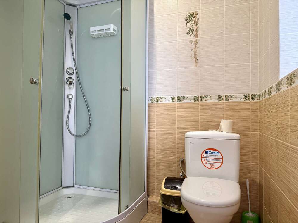 — Двуспальная кровать и раскладной диван — Собственная ванная комната с душевой кабинкой и тёплым полом, бесплатные косметические принадлежности — Телевизор, холодильник, чайник, стол, стулья, шкаф, торшер — Ламинат или плитка, нейтральный интерьер, общий или индивидуальный балкон