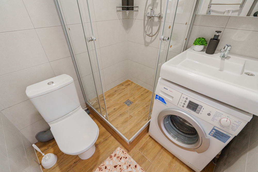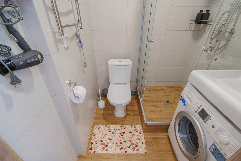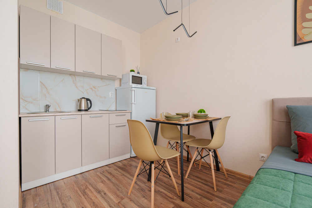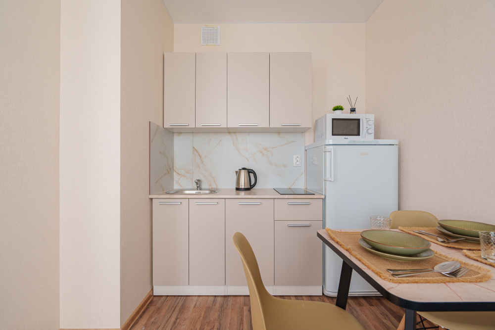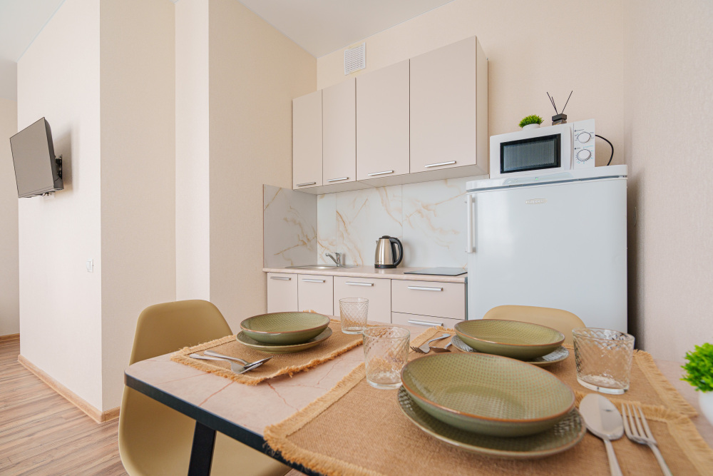 - кухня: холодильник, варочная панель, СВЧ печь, электрический чайник, а также весь необходимый комплект посуды и столовых приборов;