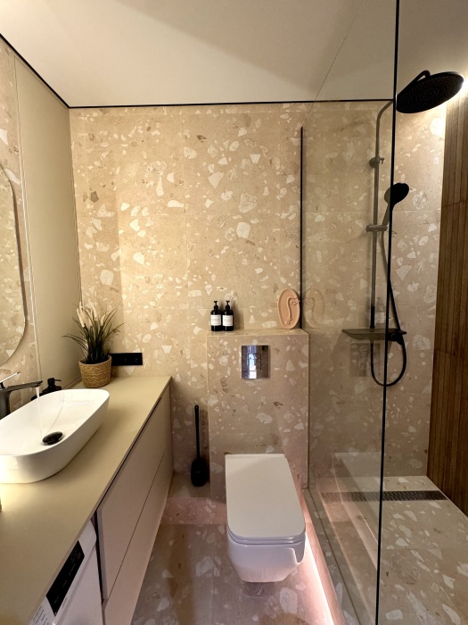 - Просторная душевая с тропическим душем и всеми необходимыми средствами гигиены.