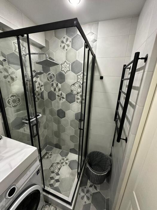 - Ванная комната оборудована теплыми полами. В душевой кабине установлен «тропический душ».