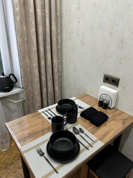 - В полностью укомплектованной кухне: холодильник, микроволновка, варочная панель, чайник, турка, фильтр для воды, необходимая посуда, столовые приборы и принадлежности.