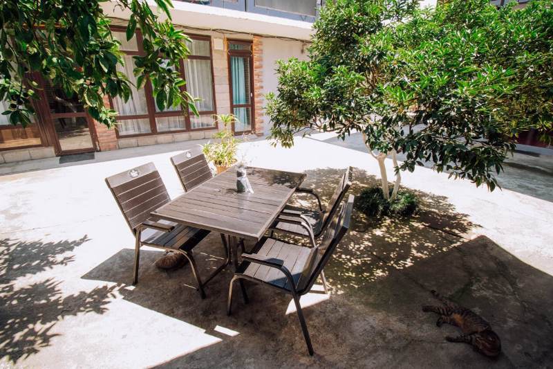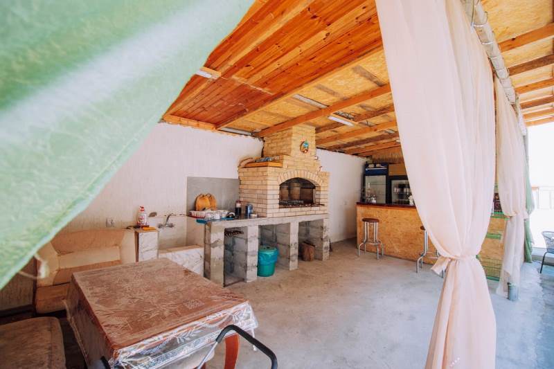 Во дворе есть зона для отдыха, беседки, столики со стульями, мангал, барбекю, зеленый двор.
