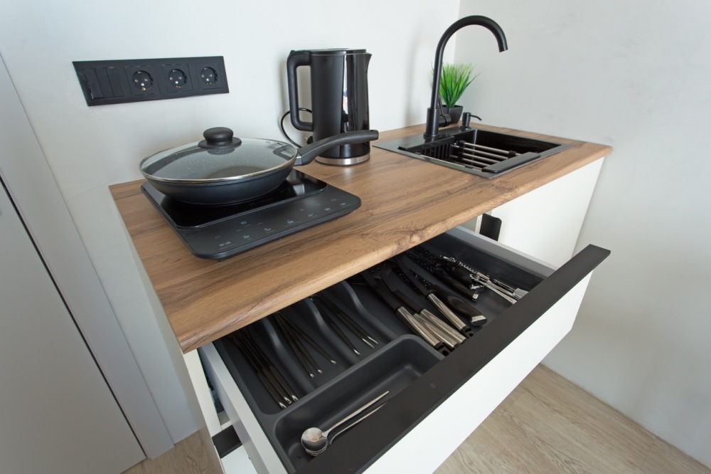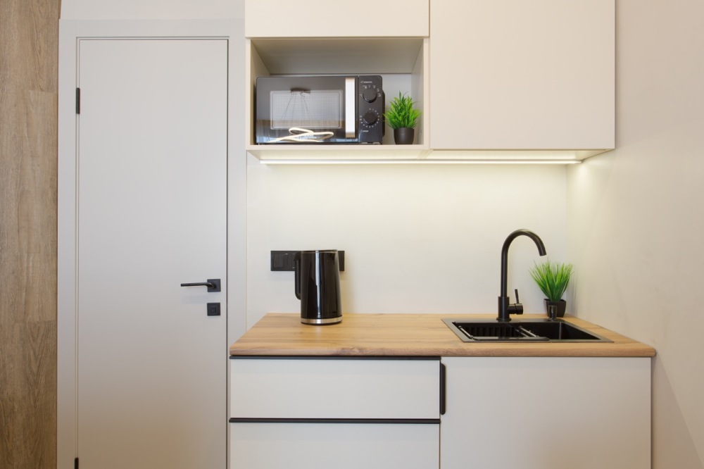 - плита, чайник, СВЧ, холодильник;