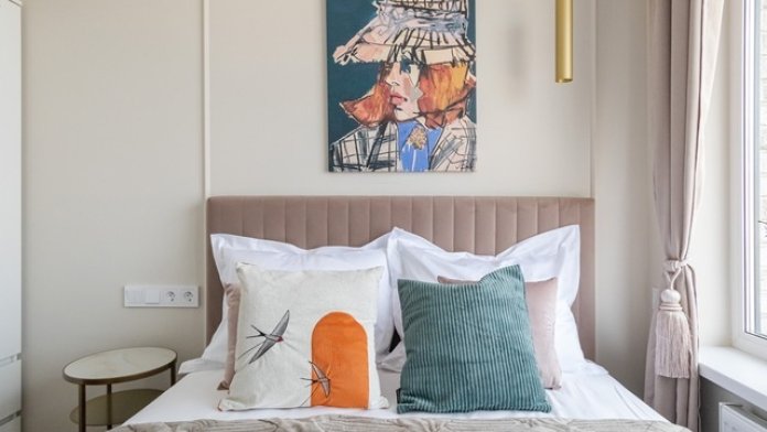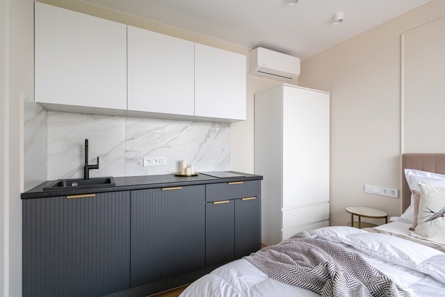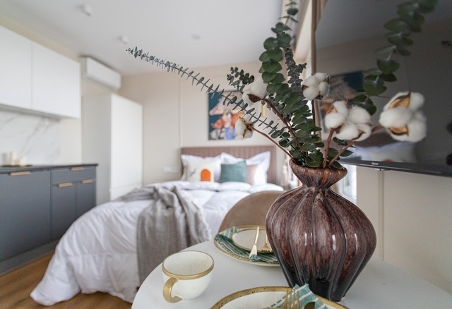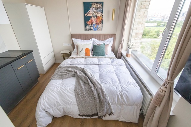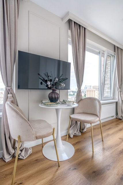 Стильная уютная студия в ЖК «Мята». Большие окна. Качественная дорогая мебель и техника. Интерьер продуман до мелочей. Апартаменты, откуда не хочется уезжать. Метро «Хорошевская» (10 минут пешком).